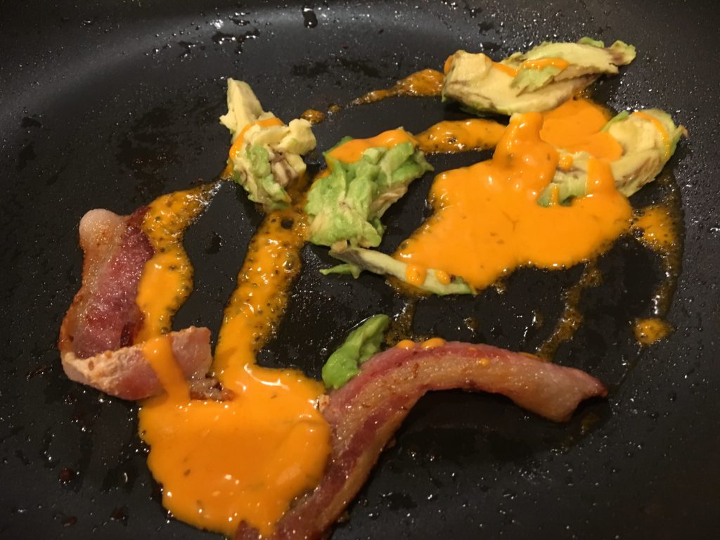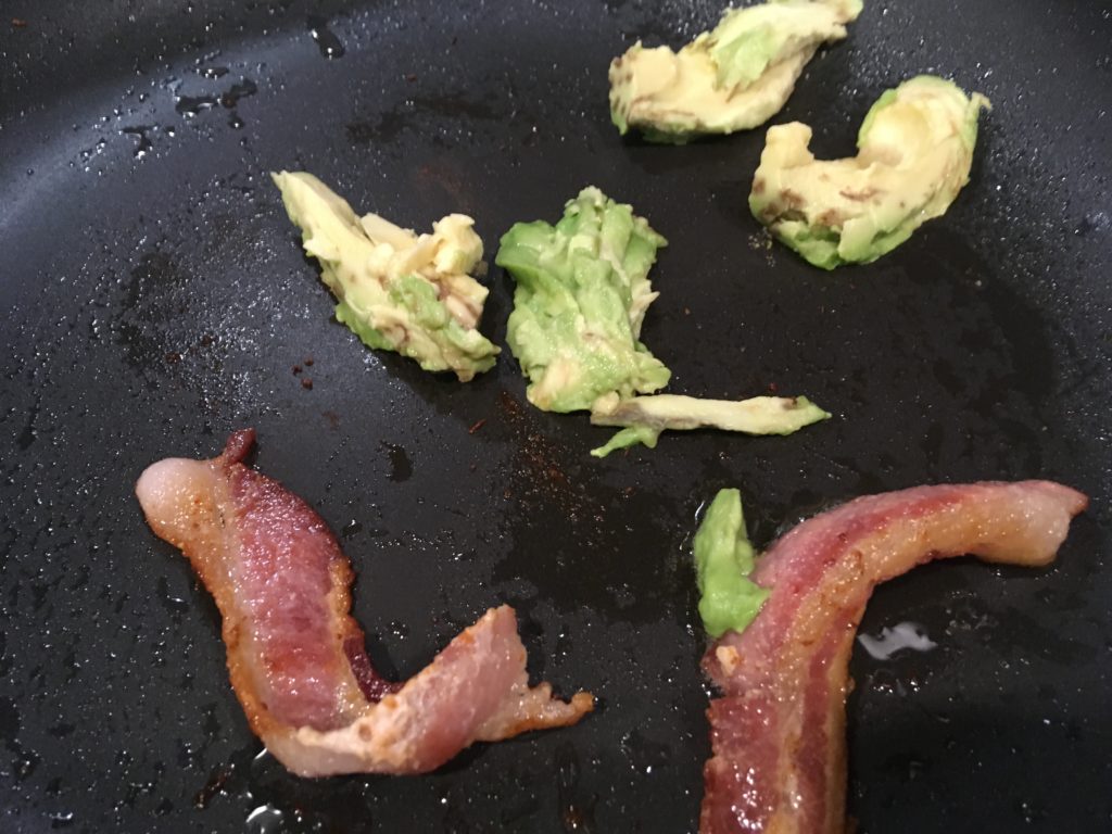 アボカドは半分だけちょっと温めた。半分はそのまま。室温なので、問題なく口の中で溶けるとは思うけど、冷めたベネディクトにはしたくないので。ベーコンを入れる必要はまったくない。ハムでもいいというか、別に肉類なくても問題ない。そういう些細なことは気にしないこと。