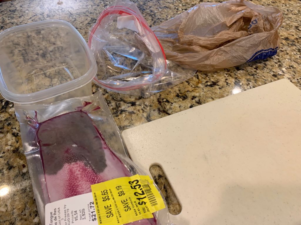 袋を開けたりする前に、まずはゴミ袋、焼いて食べるには硬い部位、焼いて食べるところ、の3種類の容器を用意。慣れてないと血液がダラダラ出るので、キッチンタオルとかも用意したほうが良い気が。