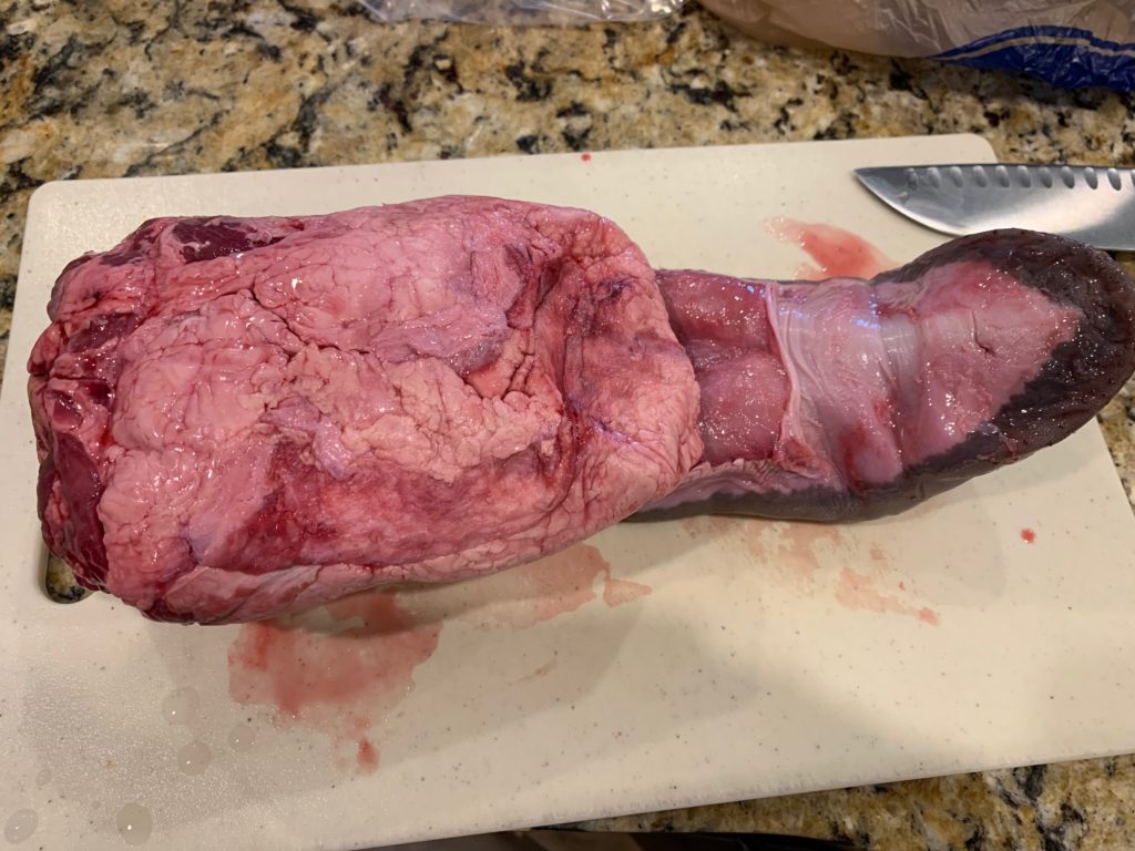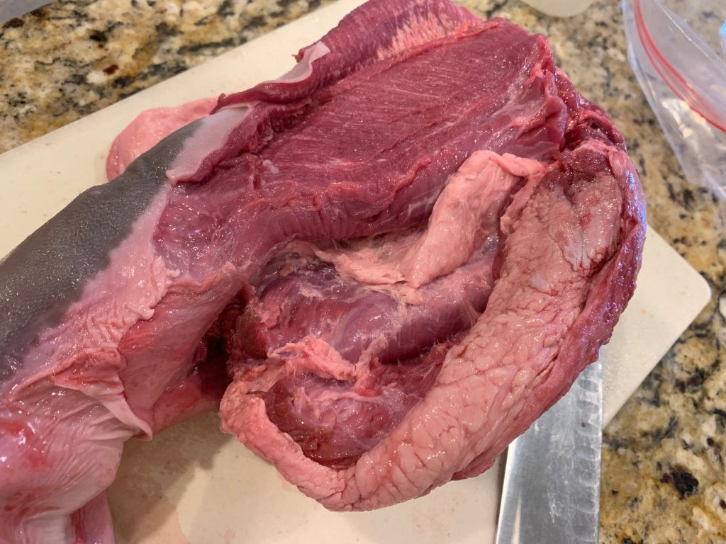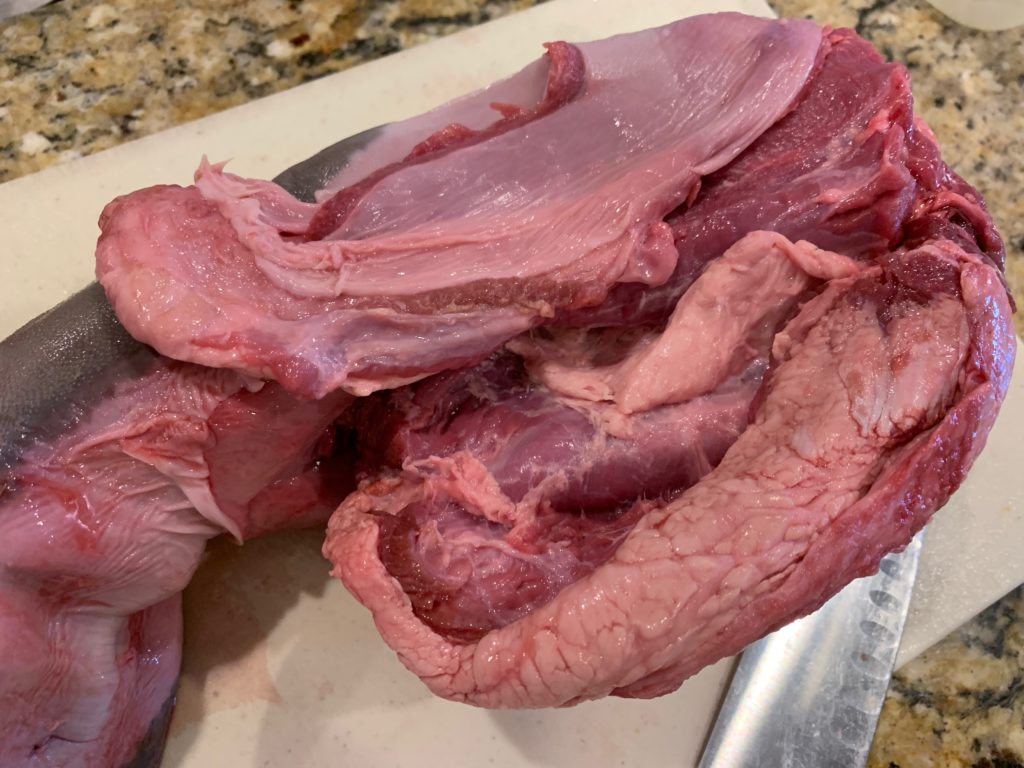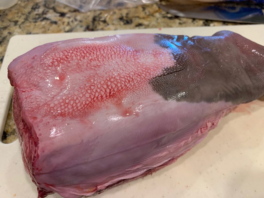 左側から。写真の上下で真ん中辺りまで皮が来てるけど、結局もう少し舌のところから切り開く感じ。上の方で切り込みが入ってるのは私が切ったんじゃなくて、たぶん解体時に誤って切られてしまった感じ。