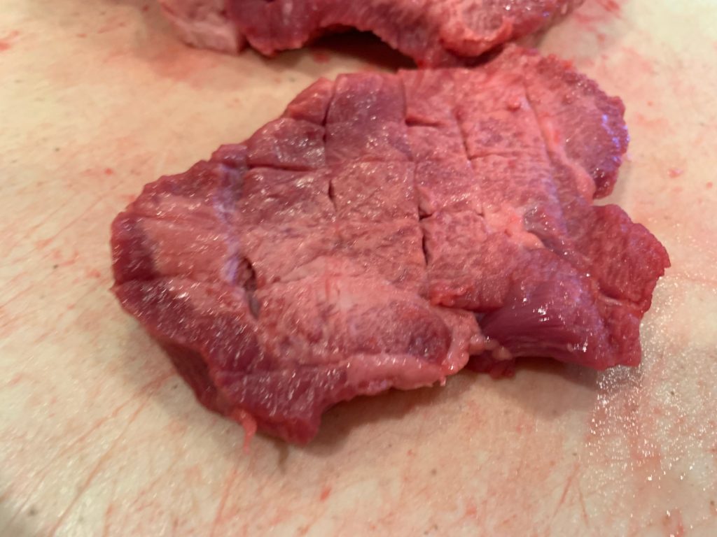 美味しい部分(脂が入って白いので、見れば分かる)だけを残し、軽く切れ目を。