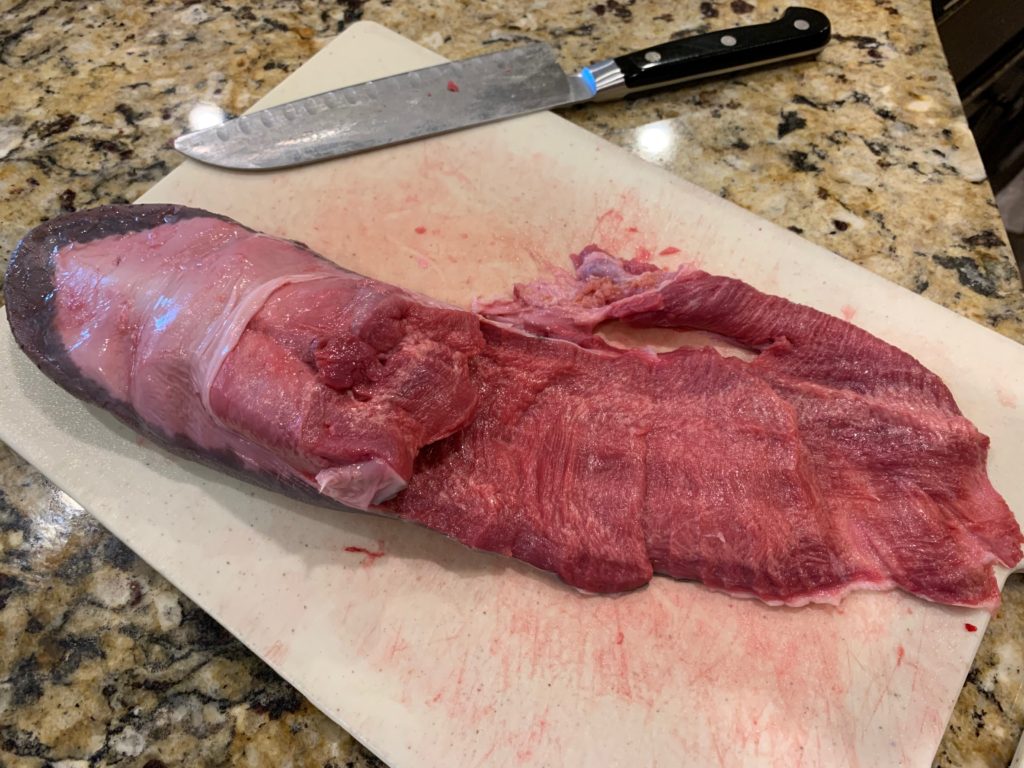 取り出します。背側(上ってこと)。見えている部分は舌の表面なので全部取り除く感じ。皮のすぐ裏側で美味しい筋肉ないので、筋肉ごと取り去ってもそんなに勿体無い気はしない。