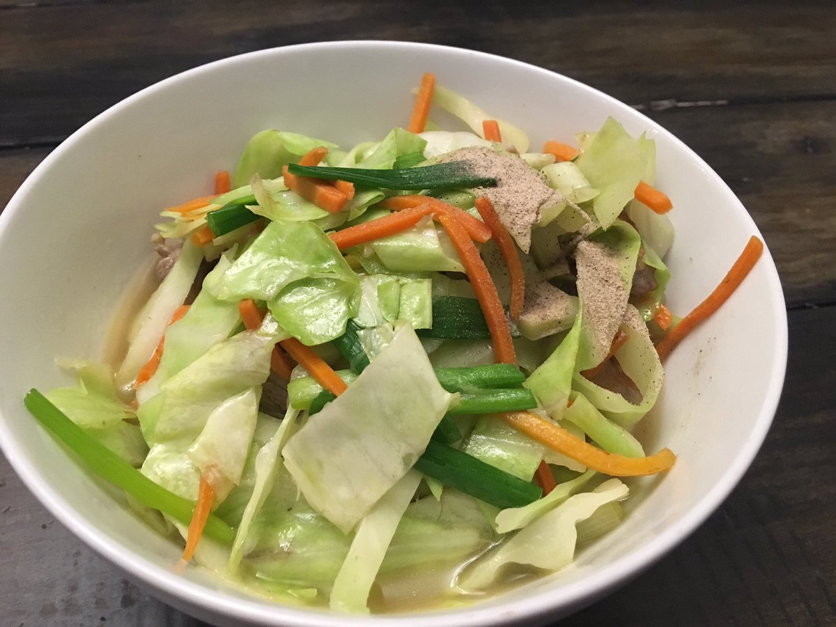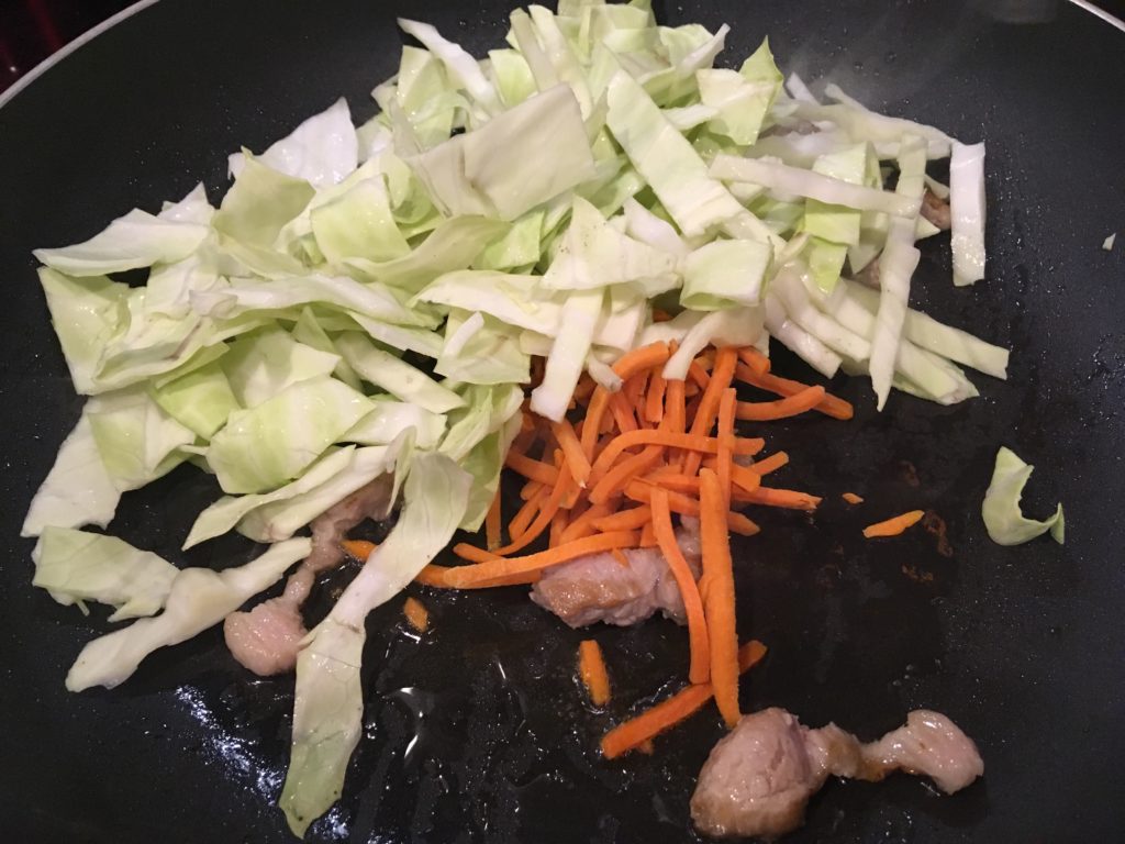 肉の表面に火が通ったらキャベツとレンチンした人参投入。