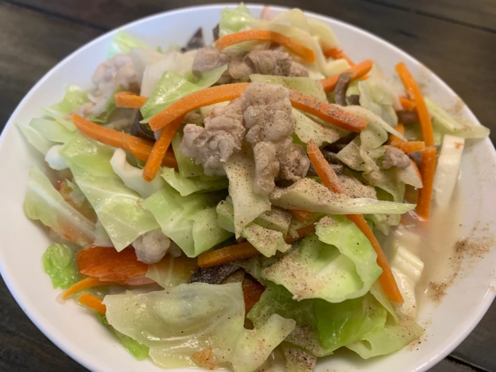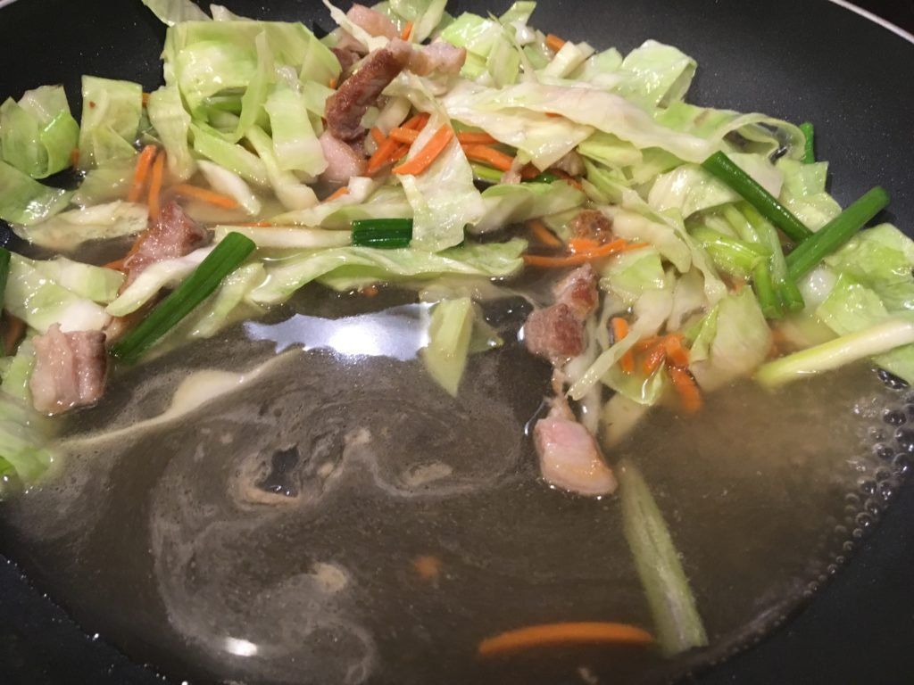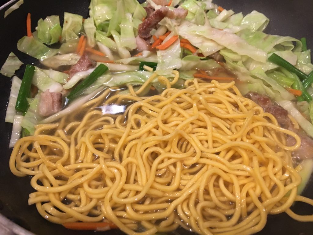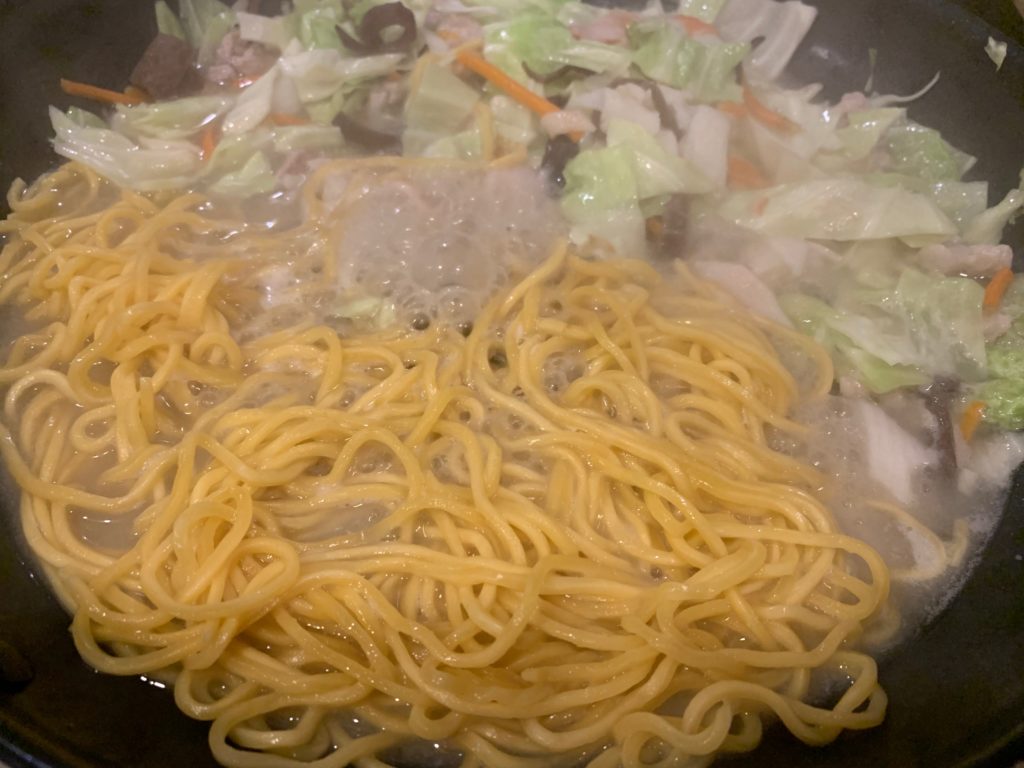 今回は中華ローメンの麺を使ったけど、水戻しスパゲティでもイケるので、かなりオススメ。