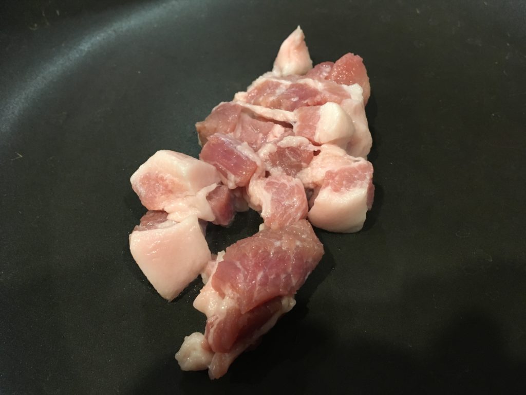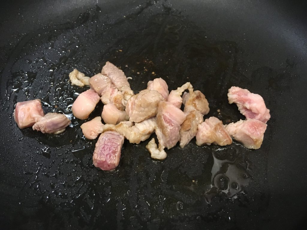 麺を茹で始めたら、豚肉を炒めよう。