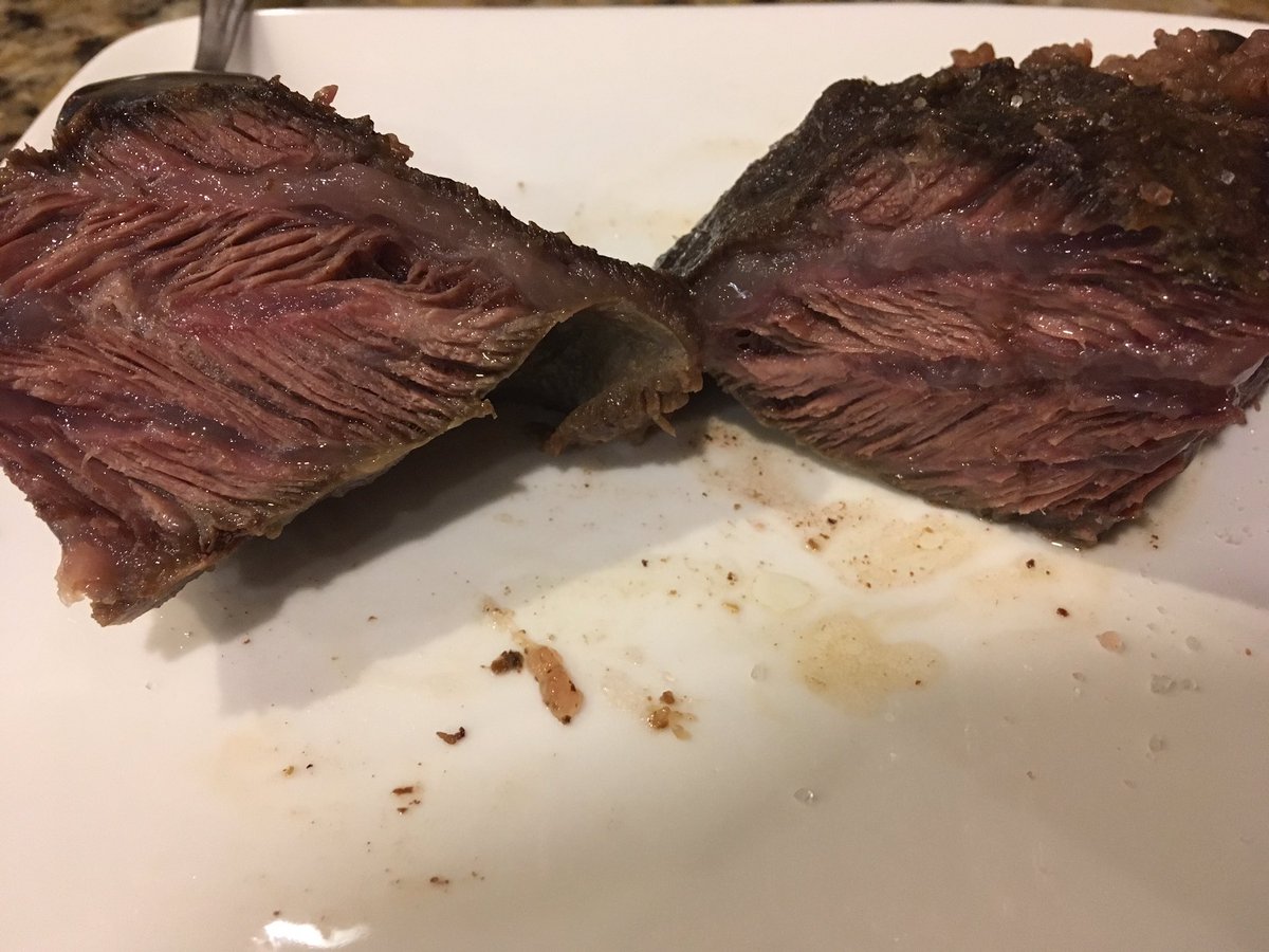 表面が焼けたらちょっとだけ水を入れて蒸す。そのまま弱火でときどき水を足しながら蒸してもいいし、95℃ (200F) のオーブンに数時間とか。5時間くらいで食べれるようになってこんな感じ。