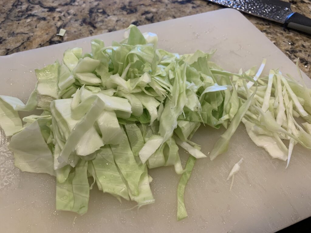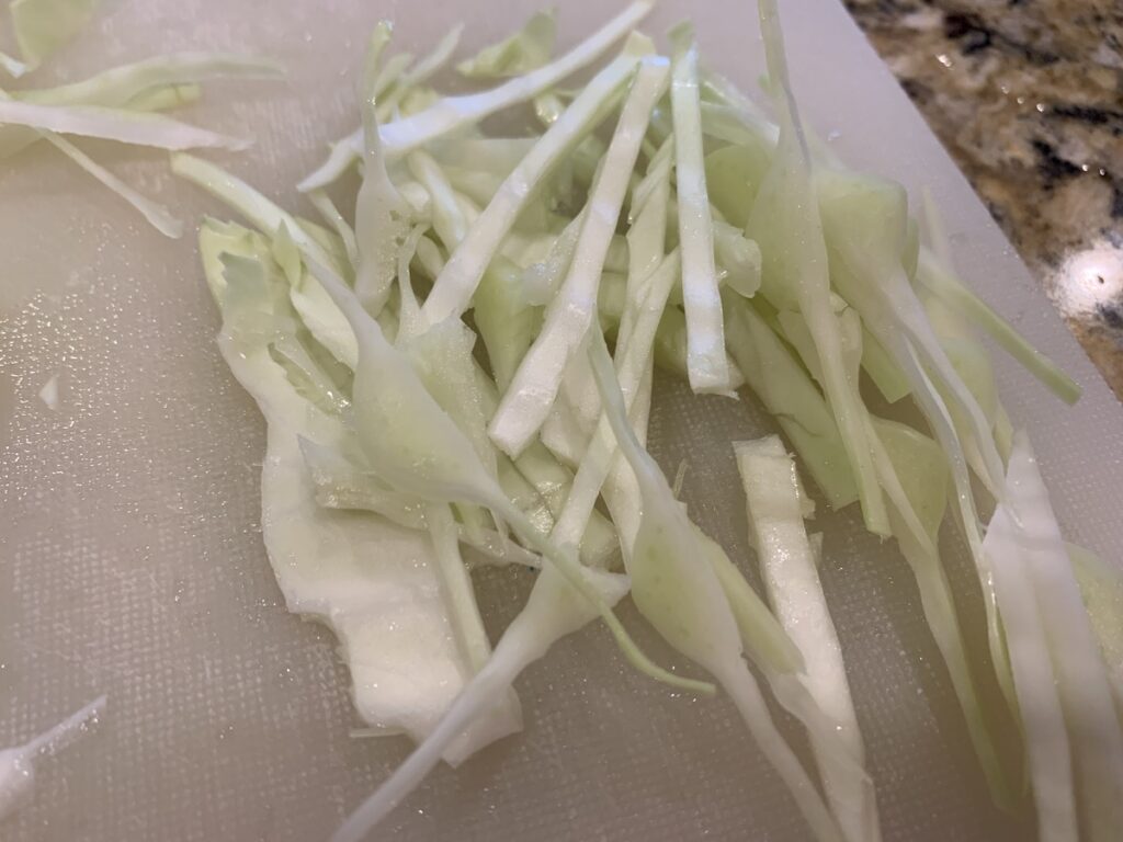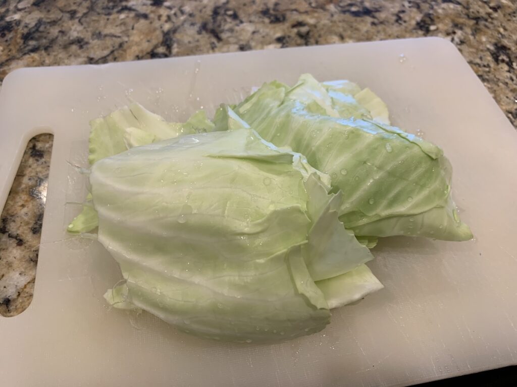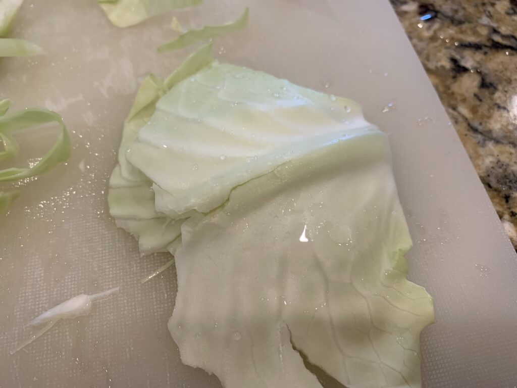 まずはメリケンキャベツ。普通のスーパーで売ってるキャベツ。日本だとグリンボールとか言うんだったっけ。日本の普通のキャベツみたいな Taiwan Cabbage / White Cabbage っていうのも売ってるけど、あれ、冷蔵庫で場所取る。この丸いキャベツは場所取らないのが何よりいい。しっかり火を通して油を染み込ませると美味いし。