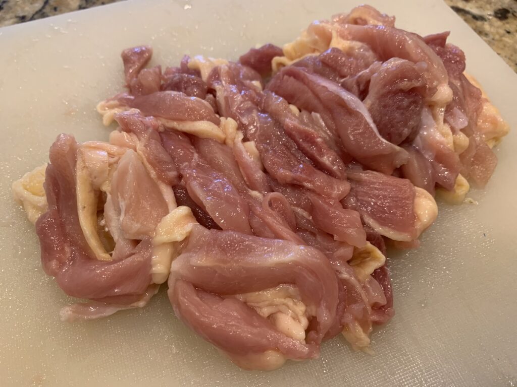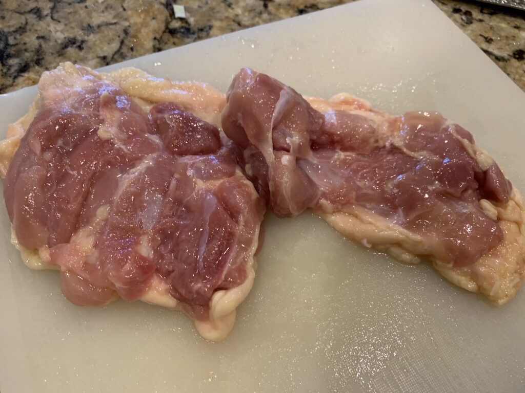 鶏もも肉。今日は皮付きが合ったけど、皮なしでもオッケー。皮なしならオリーブオイル多めに使えばいい。