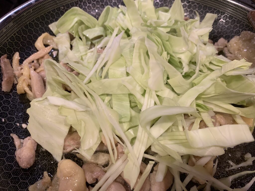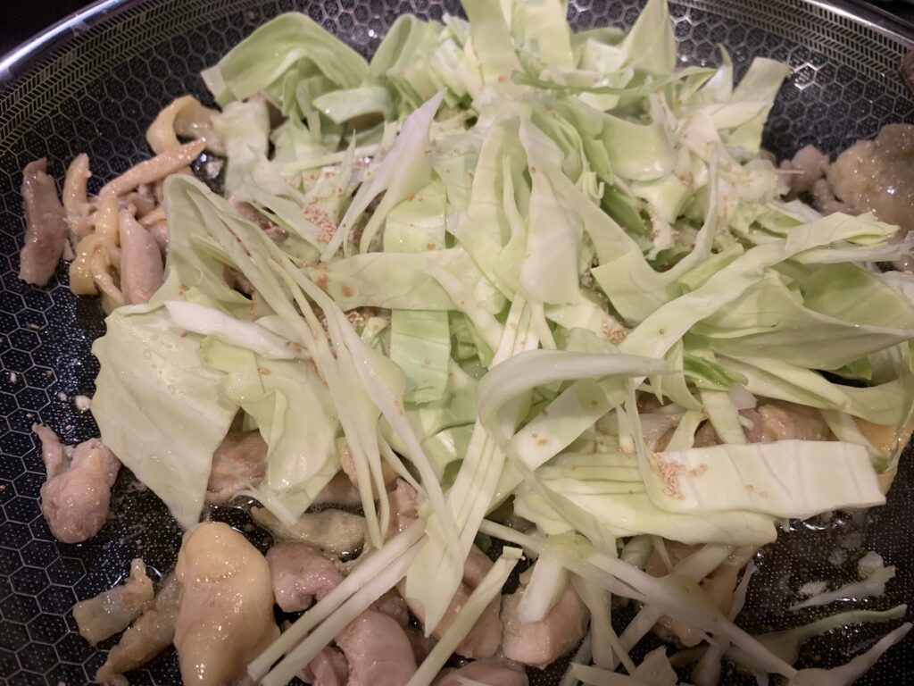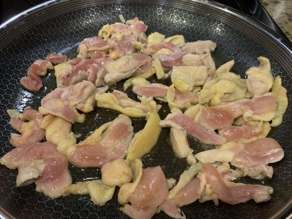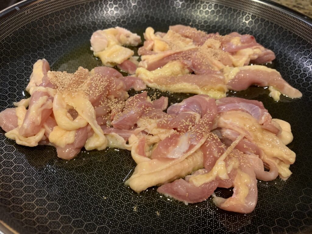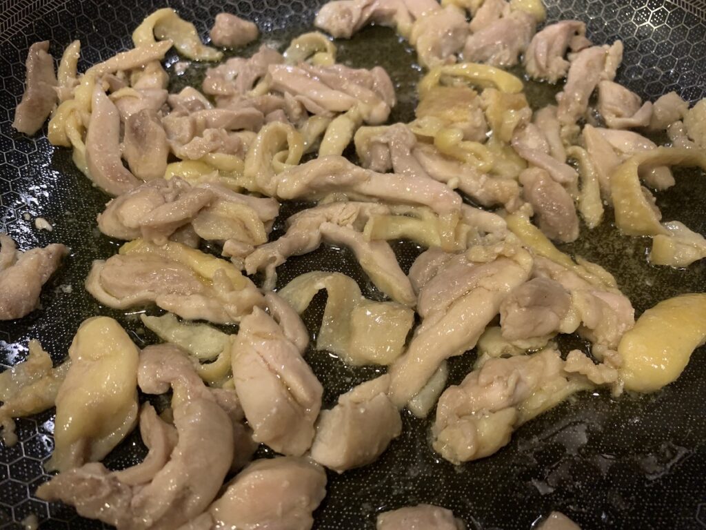 しっかり油に絡める。ここでオリーブオイルたっぷり足すと(ハネなくて)良い。鶏ももが皮なしの場合、特にしっかり足そう。