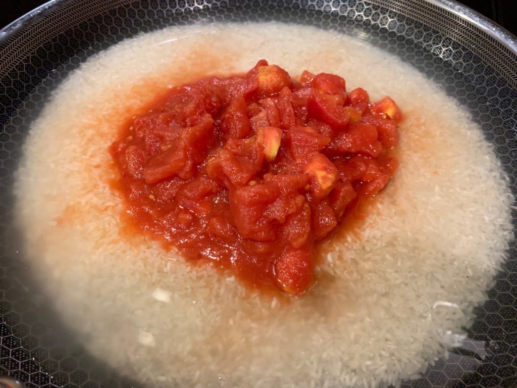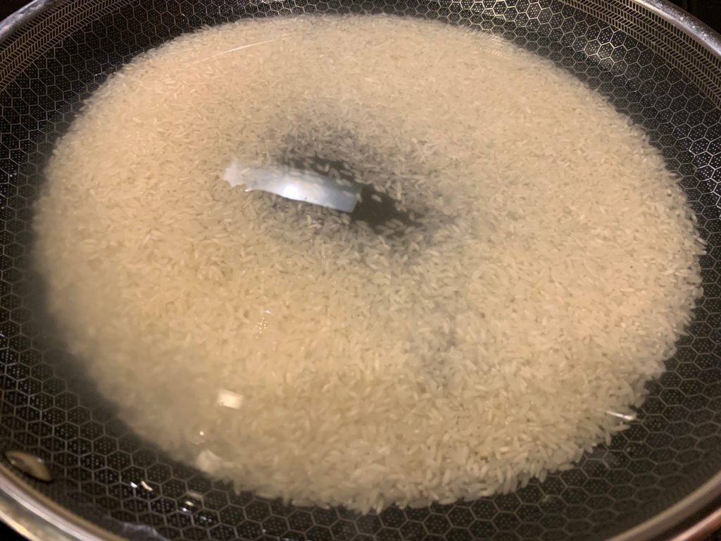 フライパンに米と水。同量くらい入れたのだが、あとでかなり水足したのであまり関係無さそう。