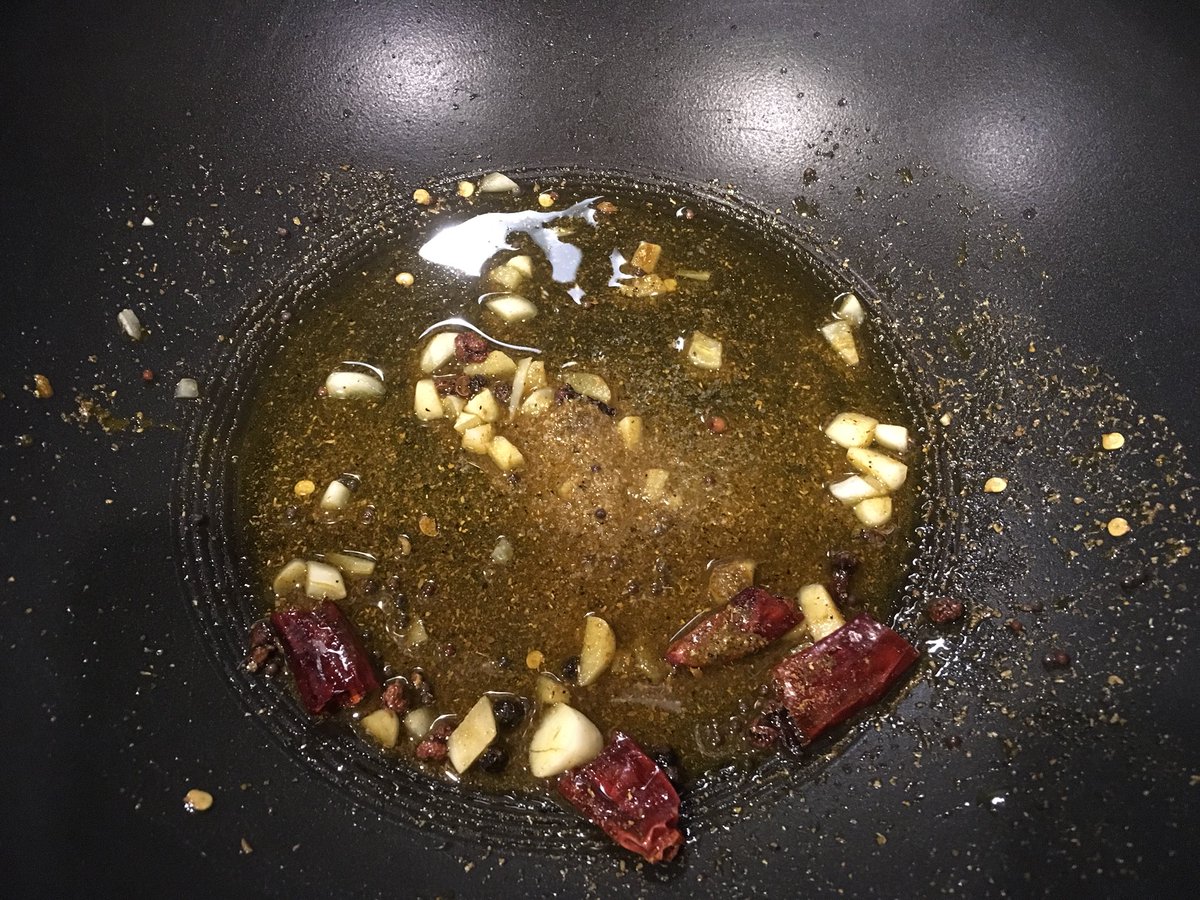 クローブ、マスタードシード、カルダモン、黒胡椒、花椒、唐辛子、ニンニク、ゴマ油。(太字は必須。ほかは無くてもイケる。)