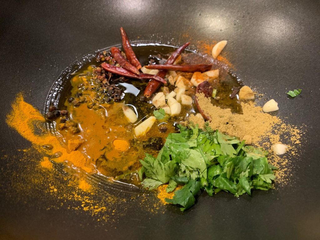 ターメリック、クーミン、クローブ、ナツメグ、コリアンダー、オールスパイス、などなどカレーと関係ありそうなやつで家にあったやつは全部入れた。あとは唐辛子と花椒。何を入れると美味しいとかそういうやつじゃなくてもうとにかく入れまくればいいみたいな価値観。どうせめちゃくちゃ騒がしい。それが美味い。