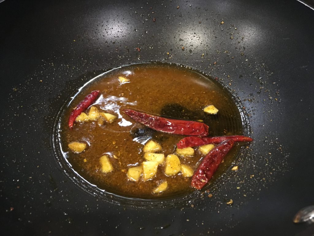 まずは大量の油にニンニクとカレー粉と唐辛子。別に唐辛子は無くてもいいけど、出汁が出る。あと見た目。