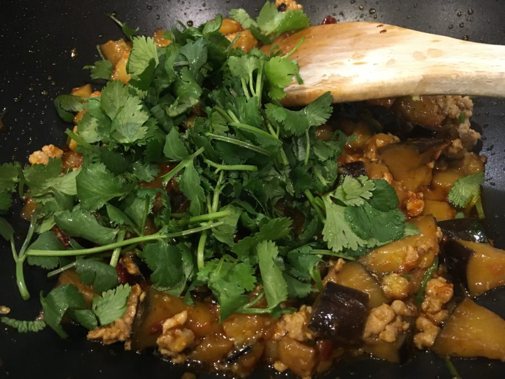肉を入れて火が通ったら、豆板醤。お好みでシャンツァイを。なければパクチー、それもなければシラントロ、もしくはコリアンダーでも良い。なくてもよい。