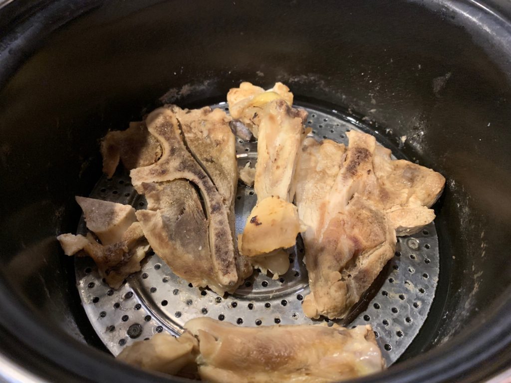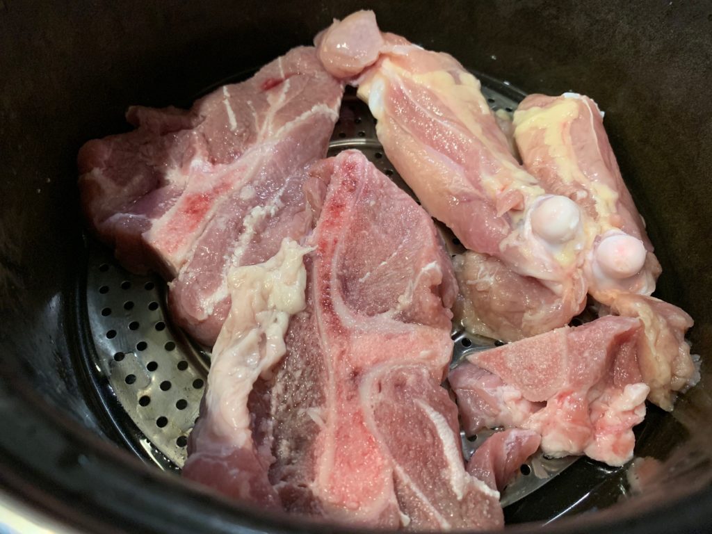 鶏と豚。骨とその周りの肉を冷凍しておいたもの。蒸す理由があったかどうかはわからないが、蒸しといた。別に茹でればすむと思うけど。