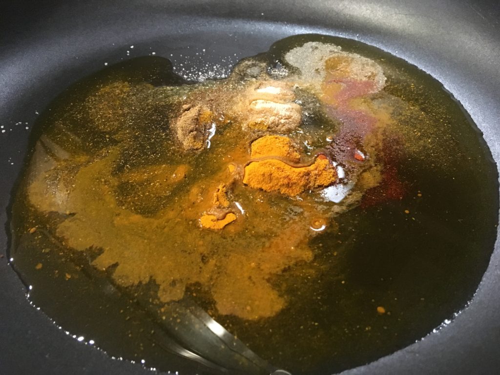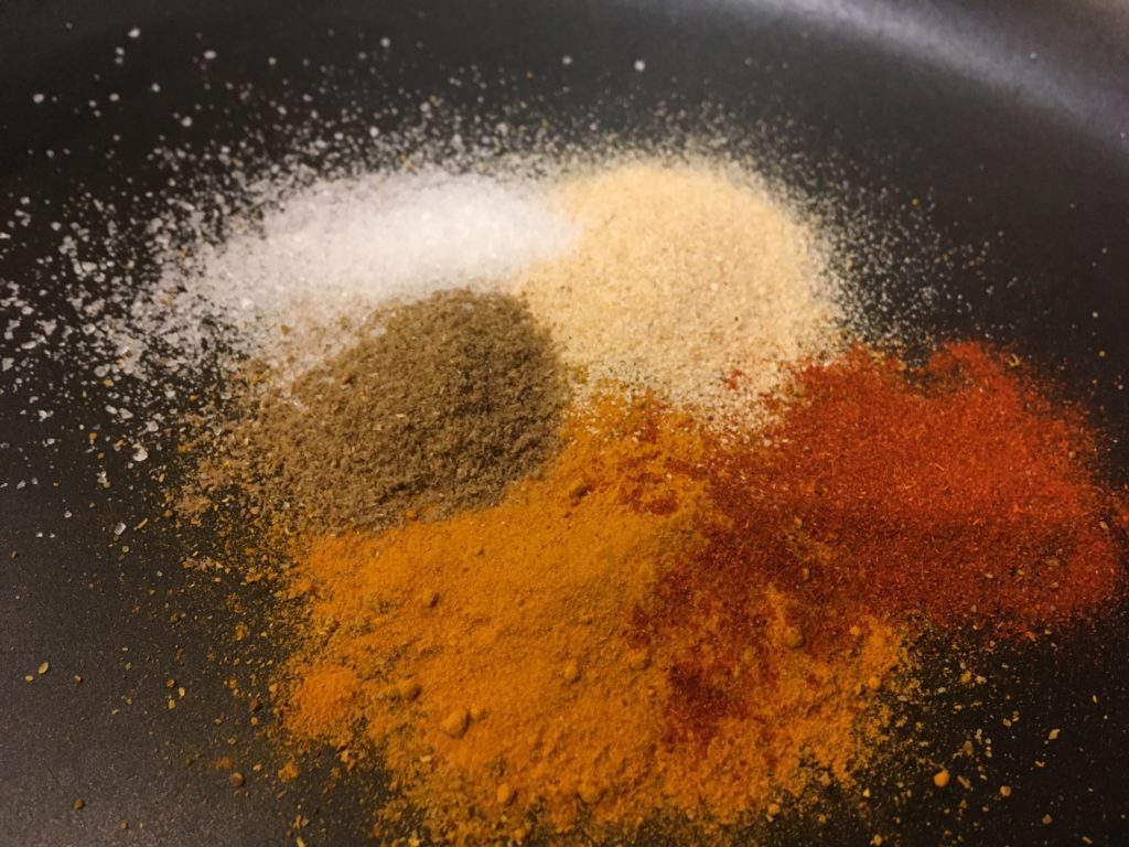 8分レンチンしてる間に鍋の準備。いわゆるカレー粉と塩とガーリックパウダー。パプリカとかターメリックとかあるんなら入れたいやつ入れればいいって話。どうせ美味い。