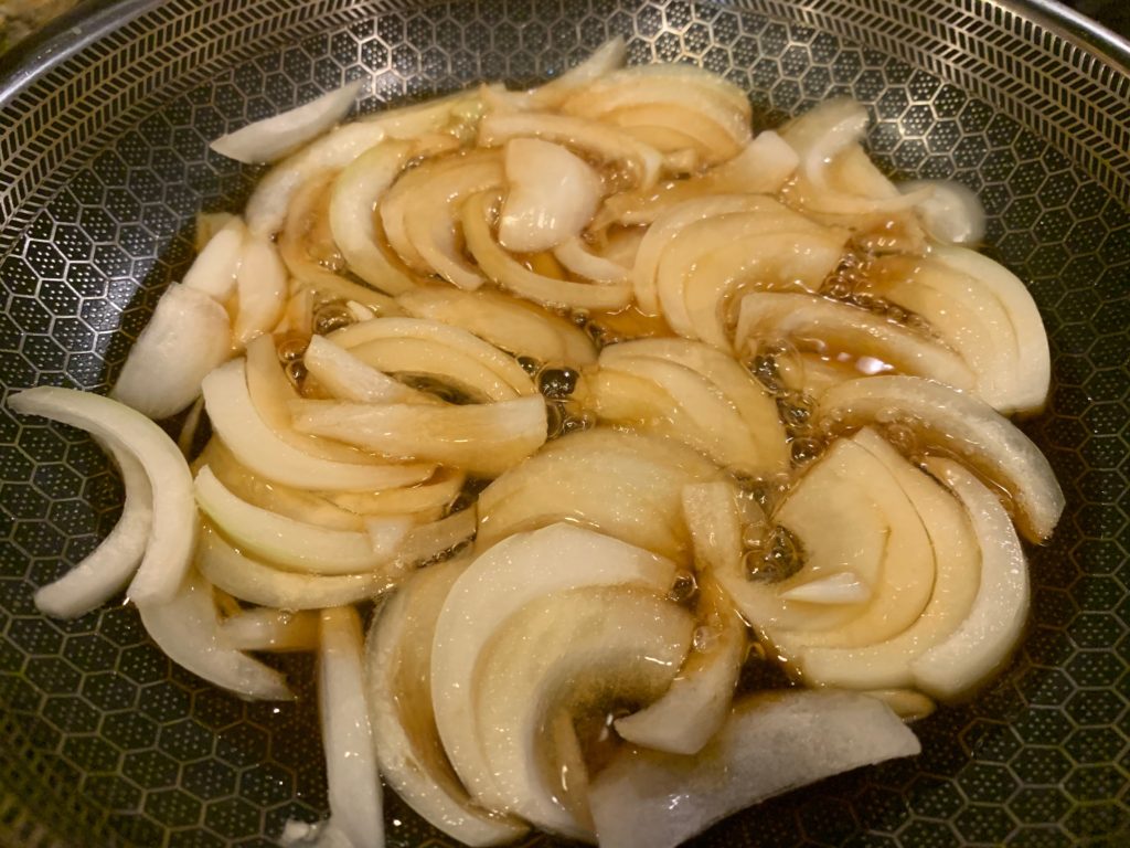 タマネギを本つゆと白ワインで煮る。中火で蓋。タマネギから水が出るので、水は不要。
