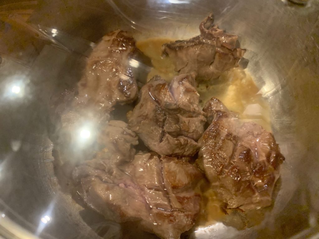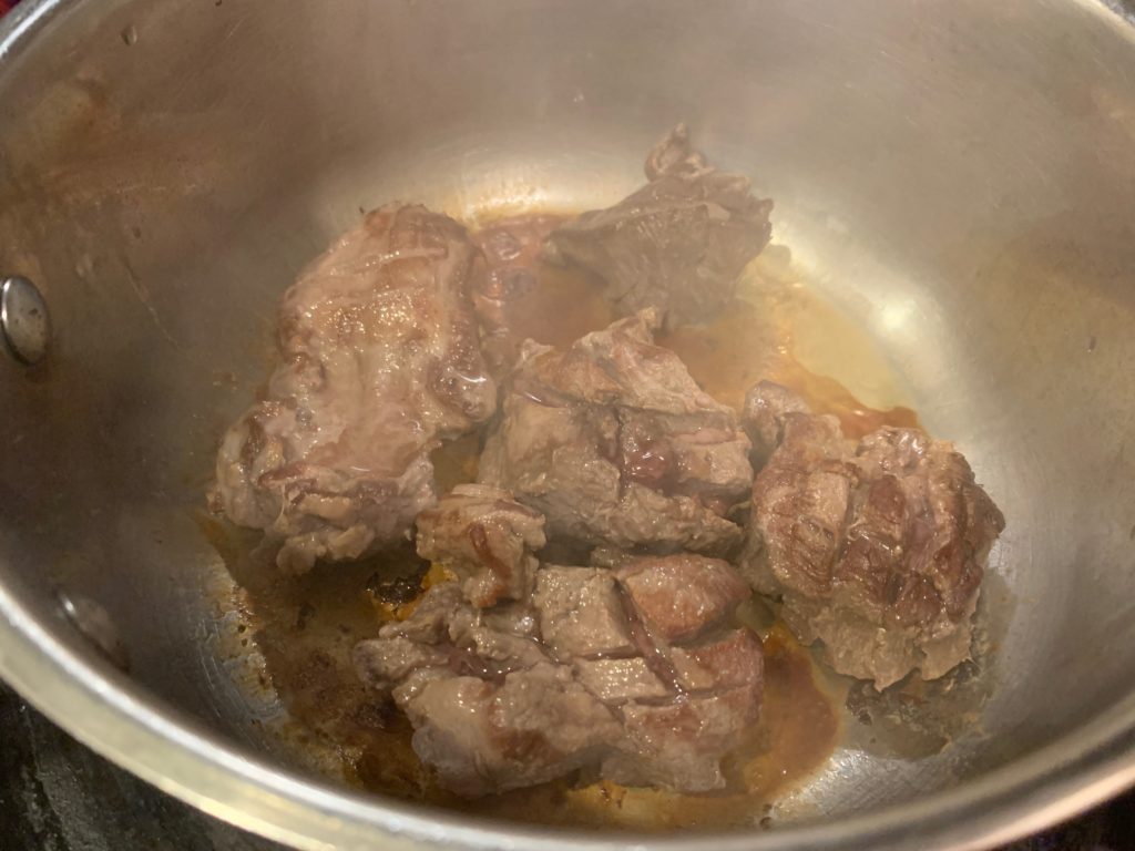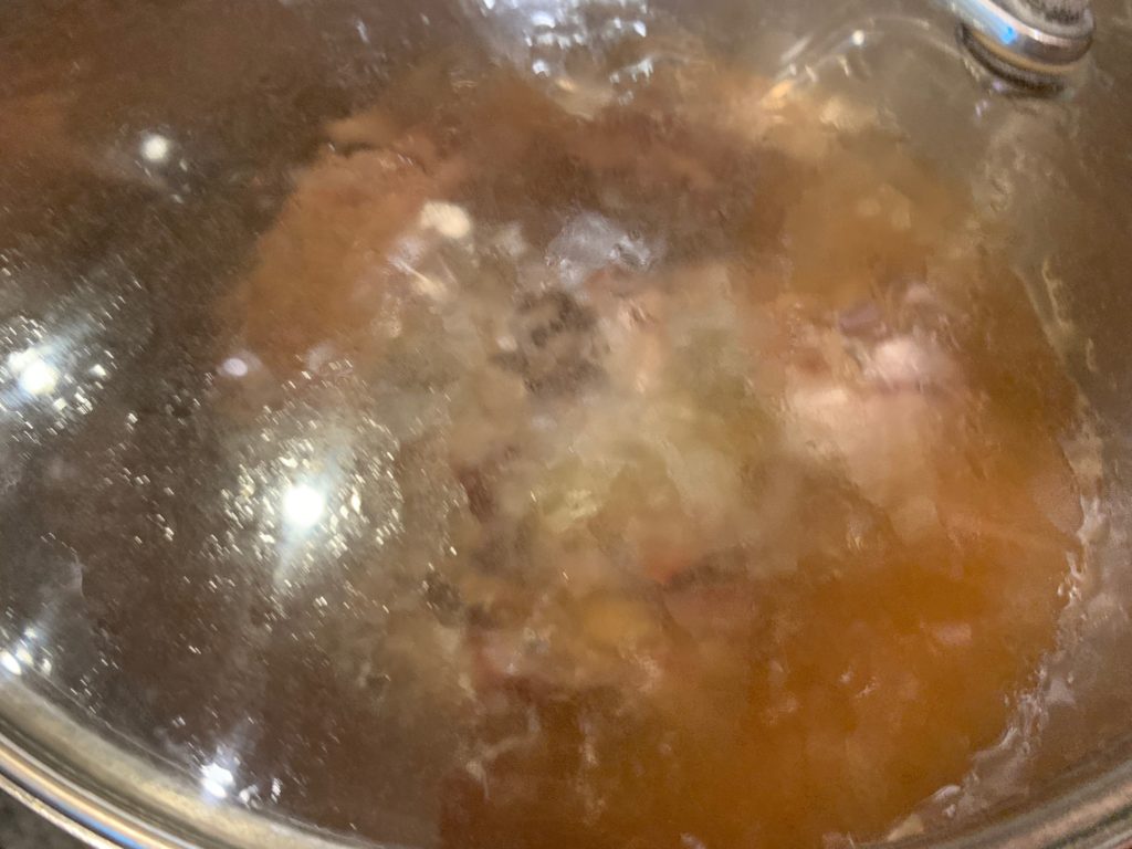 ウォッカが消えたら塩たっぷりとお湯を入れる。肉が浸かる程度でいい。欲張るとスープが薄くなるだけ。