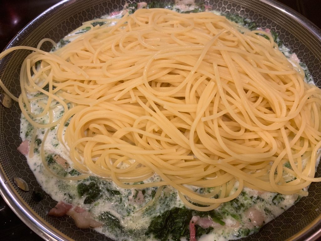 強火で煮立ったところにスパゲティ。(別にフェトチーネとかでもいいと思うけど。)トングで汁ごとドバドバかき込む。