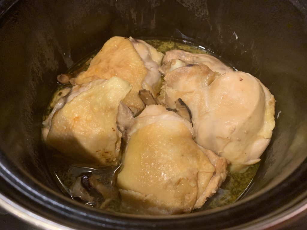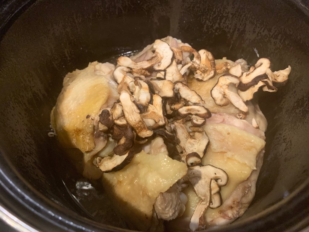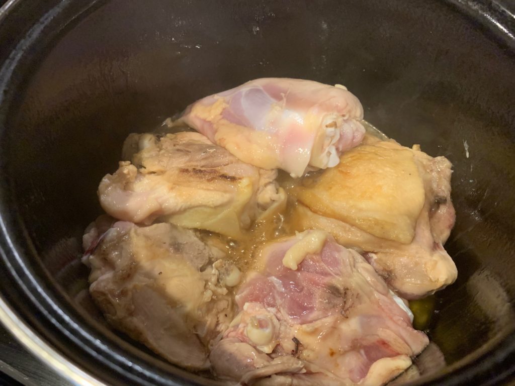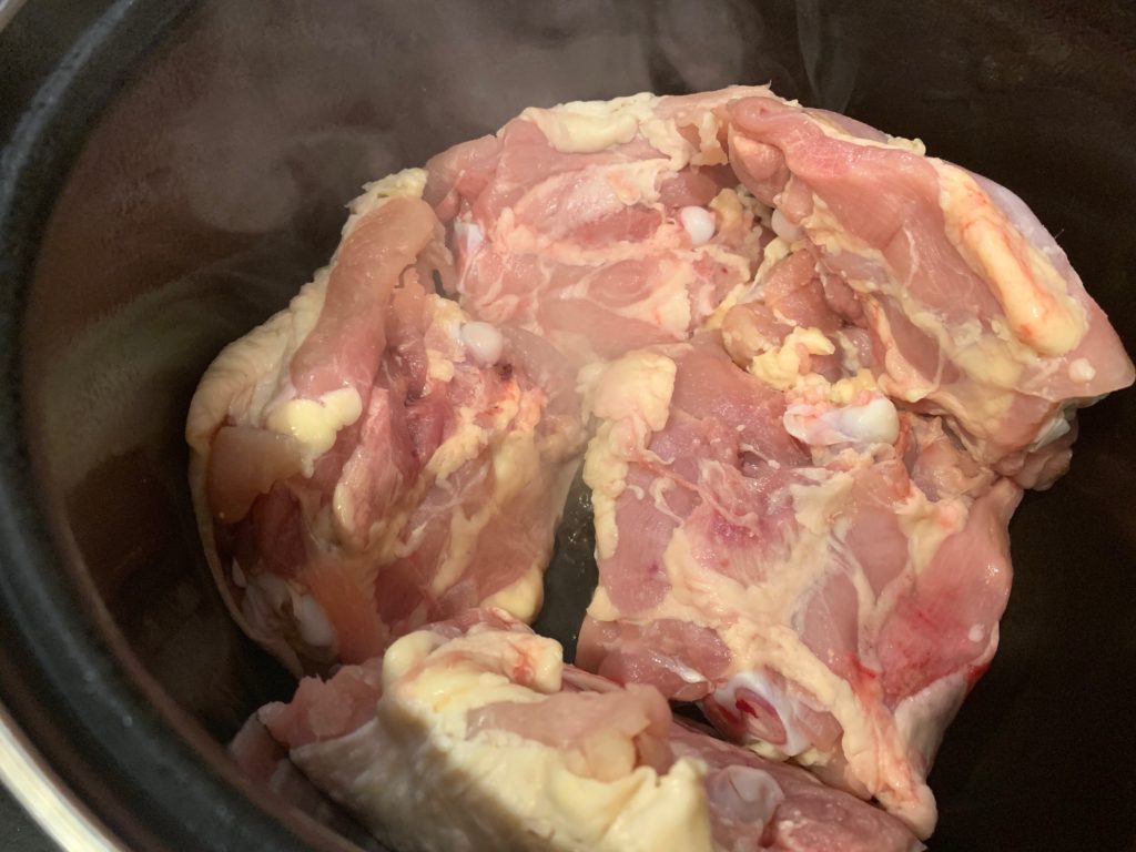 肉はなるべくイジらないが吉だが、ひっくり返して汁に。水は足さなくても筋肉から出てくるので心配なし。