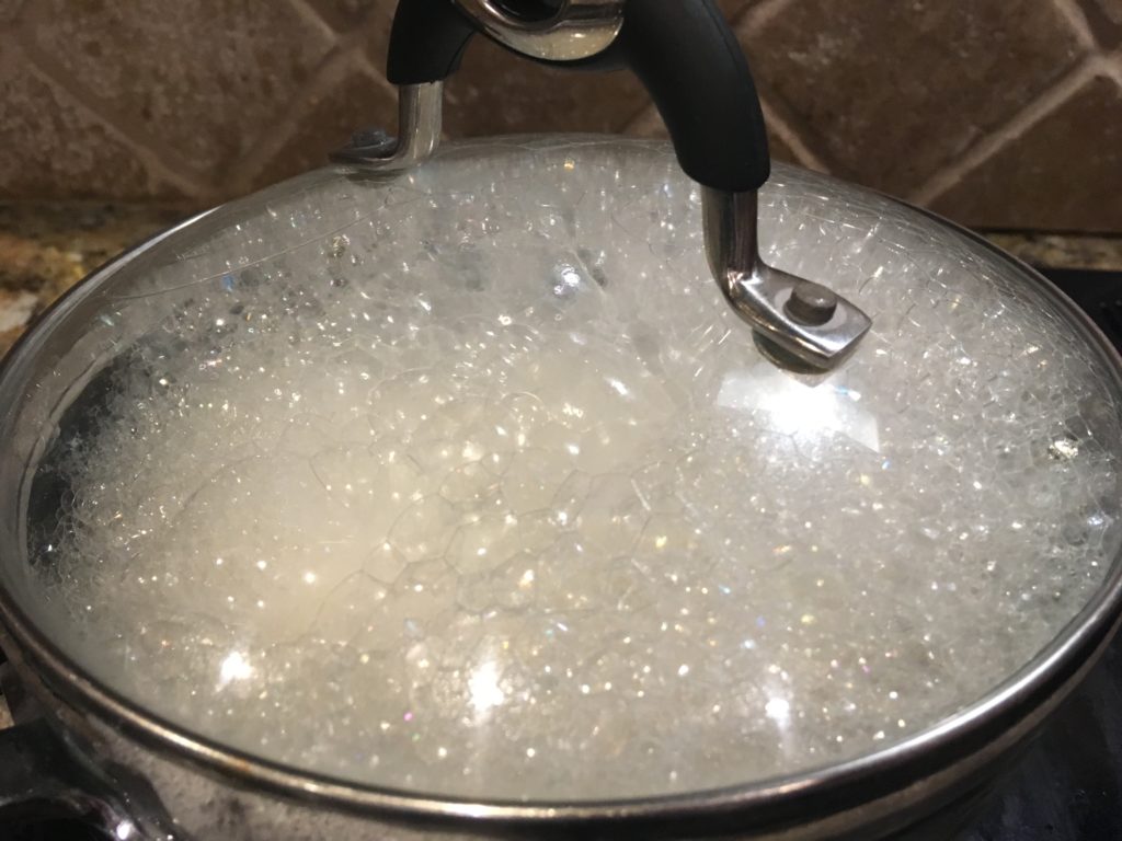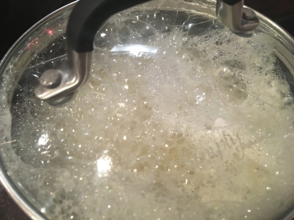 火を弱めて吹きこぼれないように保つ。なるべく火が強いほうがよいが、わからなければ弱火に(*電気です)。5-10分程度。