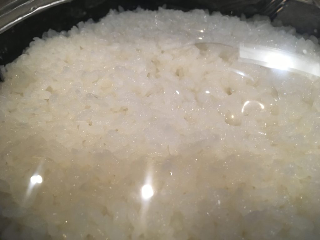 米を洗ったら(今の時代、研いだりしないでしょうし)上記の配分で鍋に。最低でも30分はこの状態で放置しよう。今日は2.5合くらい。