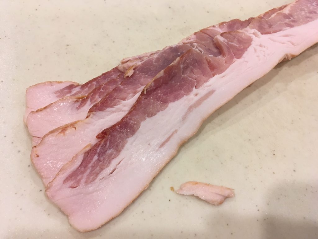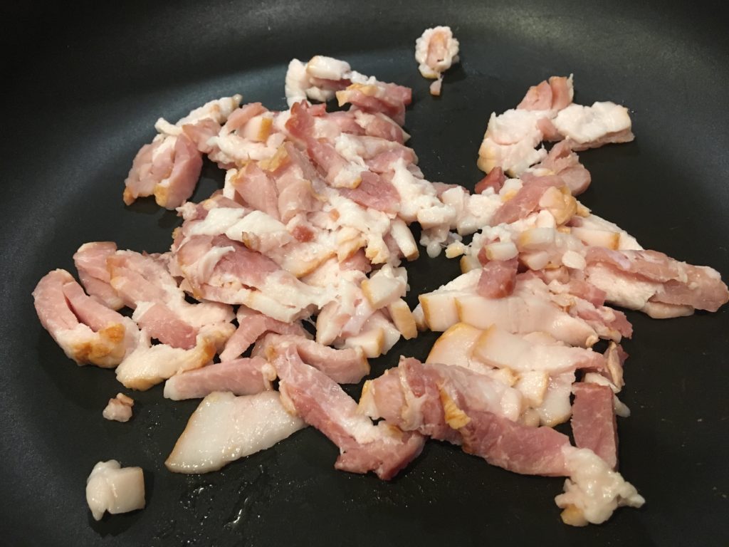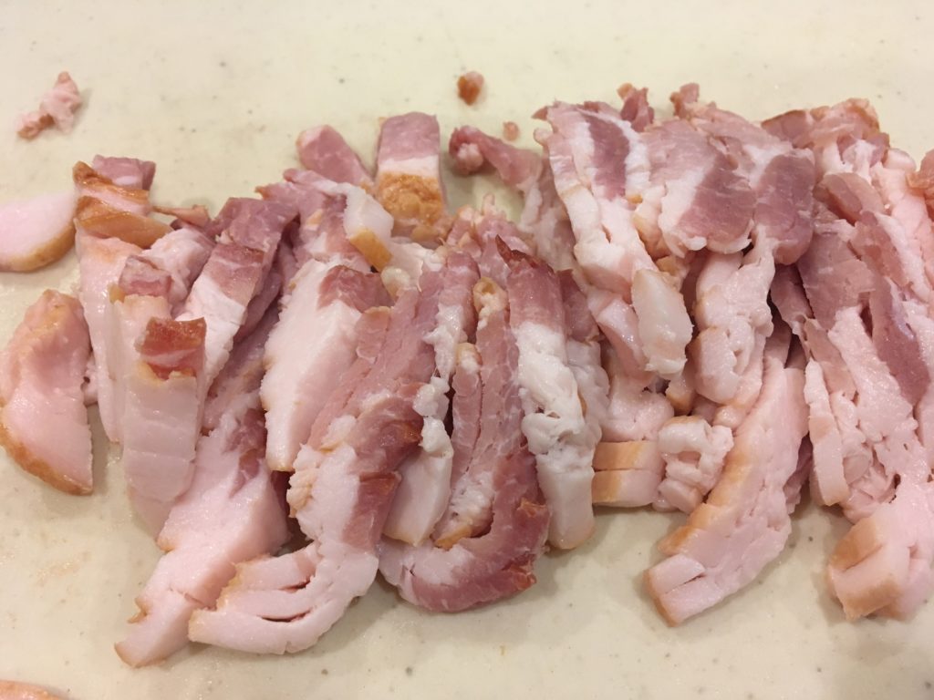 レンチンしてる間にベーコンを切る。ペンネと同じくらいの大きさに。