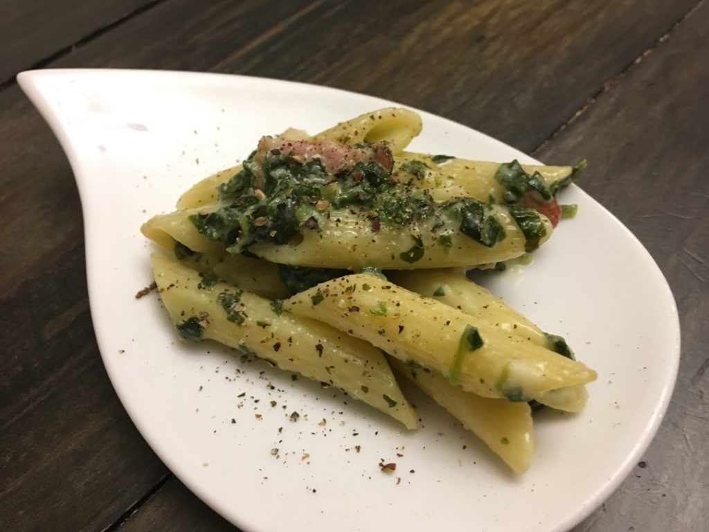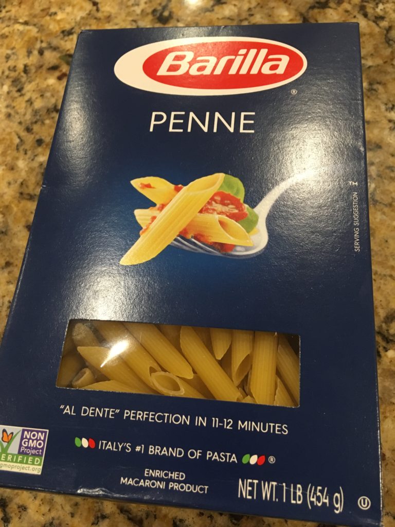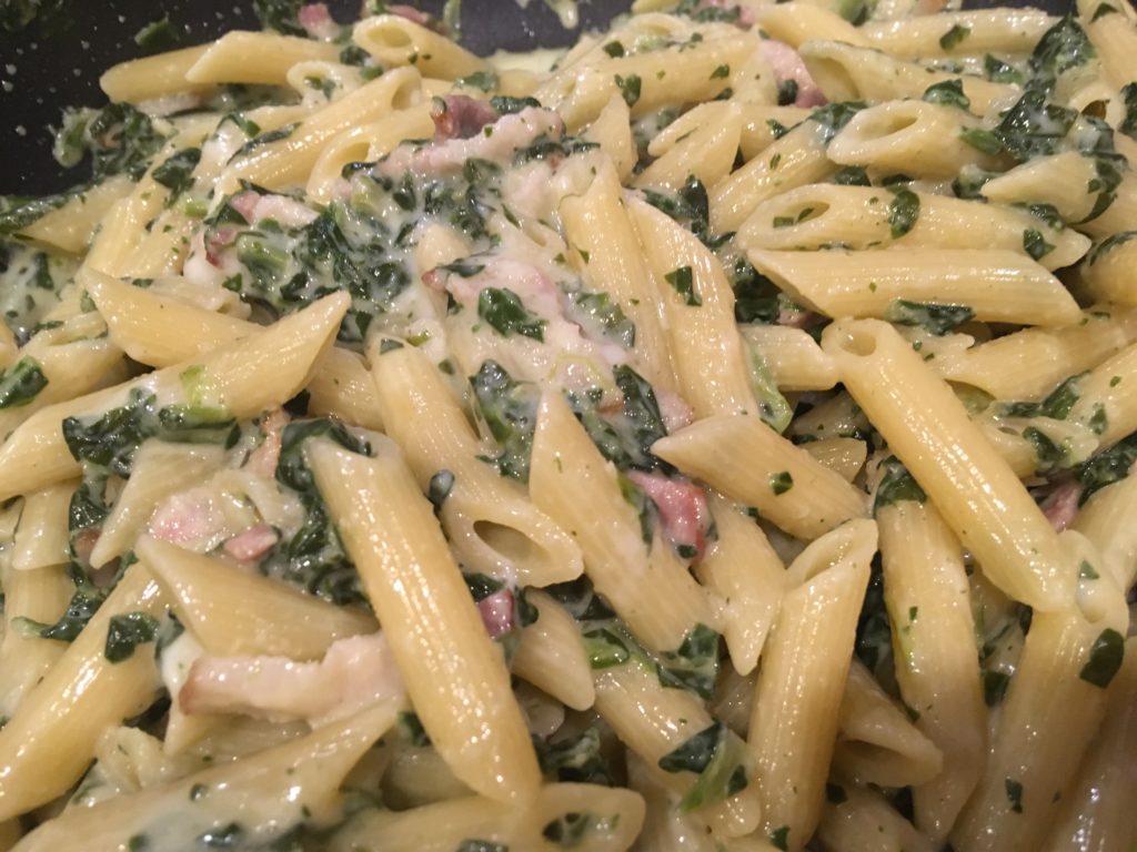 ペンネ。ペンネである必要はない。ただ、なんとなく穴の中にホウレンソウが入ってくれそうなイメージがある。一箱まるごと使うので、毎回計らずとも量が安定していて料理しやすい。(結構重要)