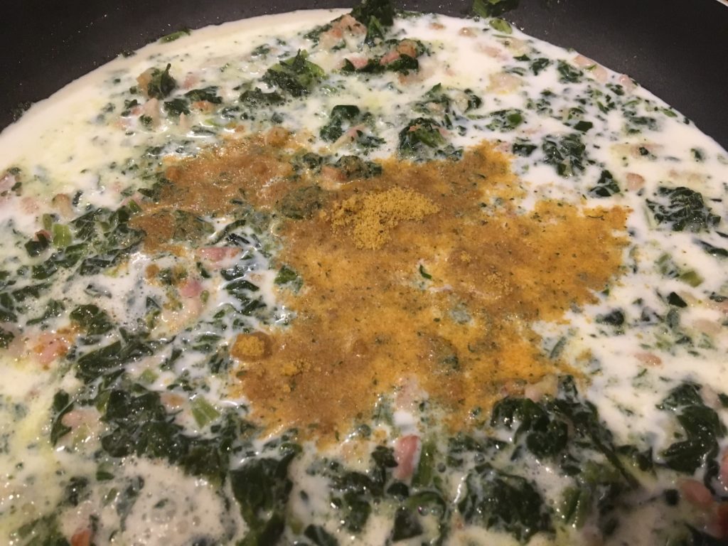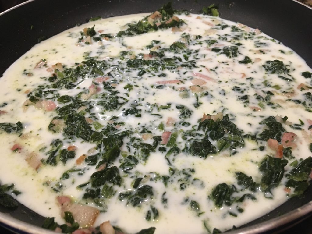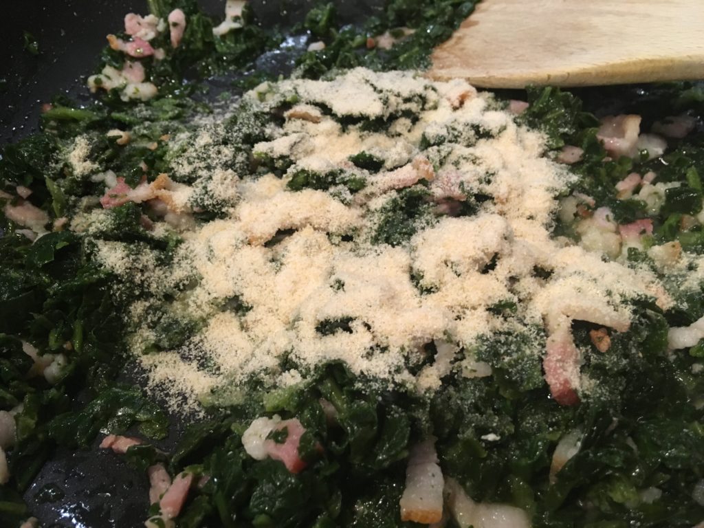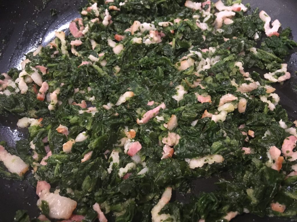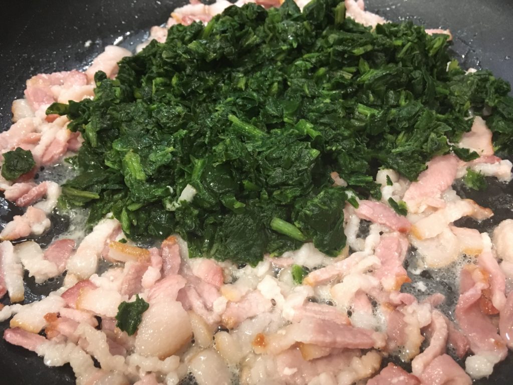 ベーコンがこれくらいの感じの頃に、レンチンしたホウレンソウ投入。