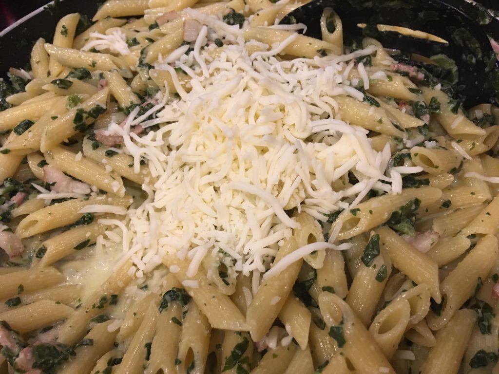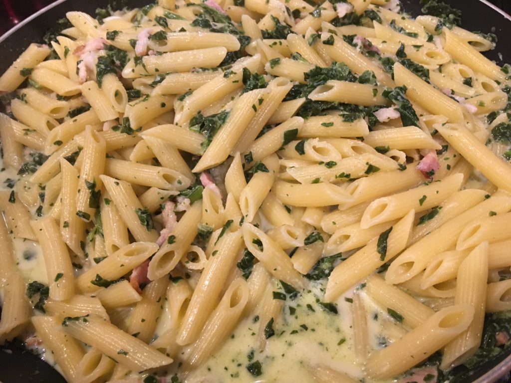 子供向けのご飯は大量に生産して冷蔵庫保存がデフォルト。今日はペンネとベーコンとほうれん草のクリームソース。とにかく子供が食べる味を。
