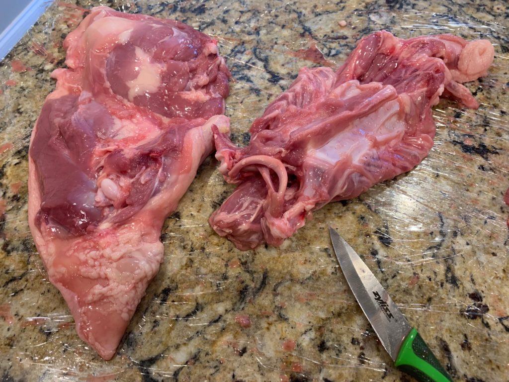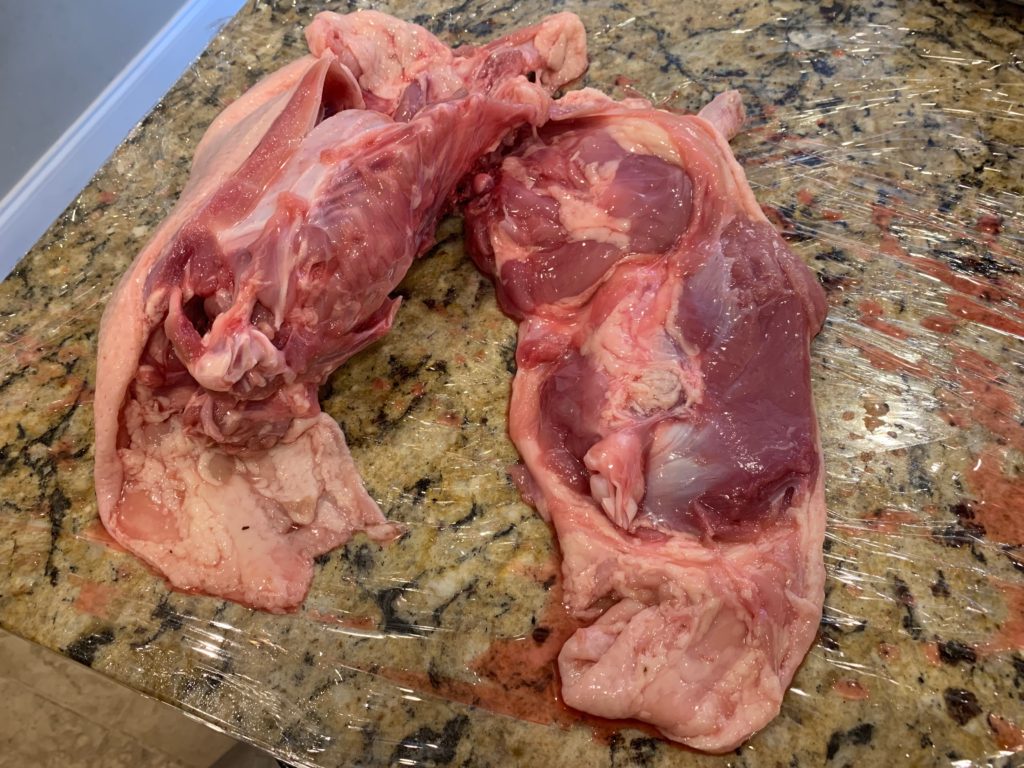 肋骨の周りにそって背骨までナイフを使いながら引き剥がす感じ。途中、大腿骨を外したりとか。関節を切ることがあっても、骨を折ったり切ったりしない。これで左側のが外れた。