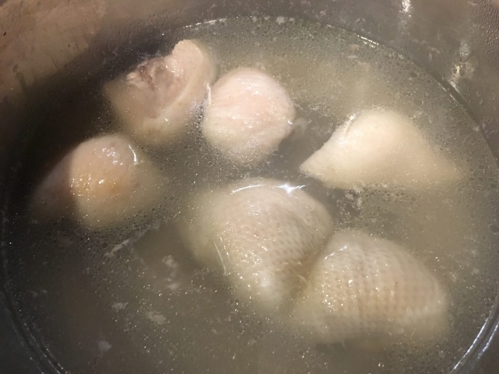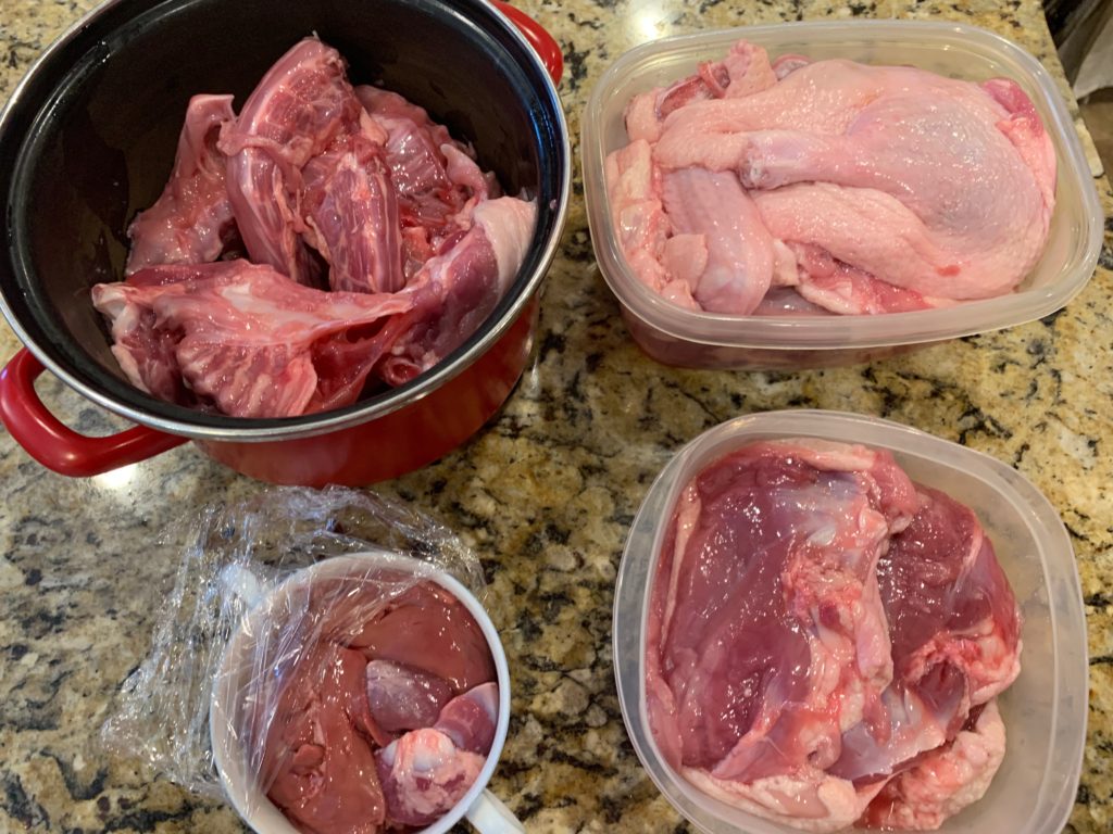 2羽解体してこんな感じ。鍋にガラ、その右にモモと手羽、その下がムネ、左下が内蔵(レバー、ハツ、砂肝)。