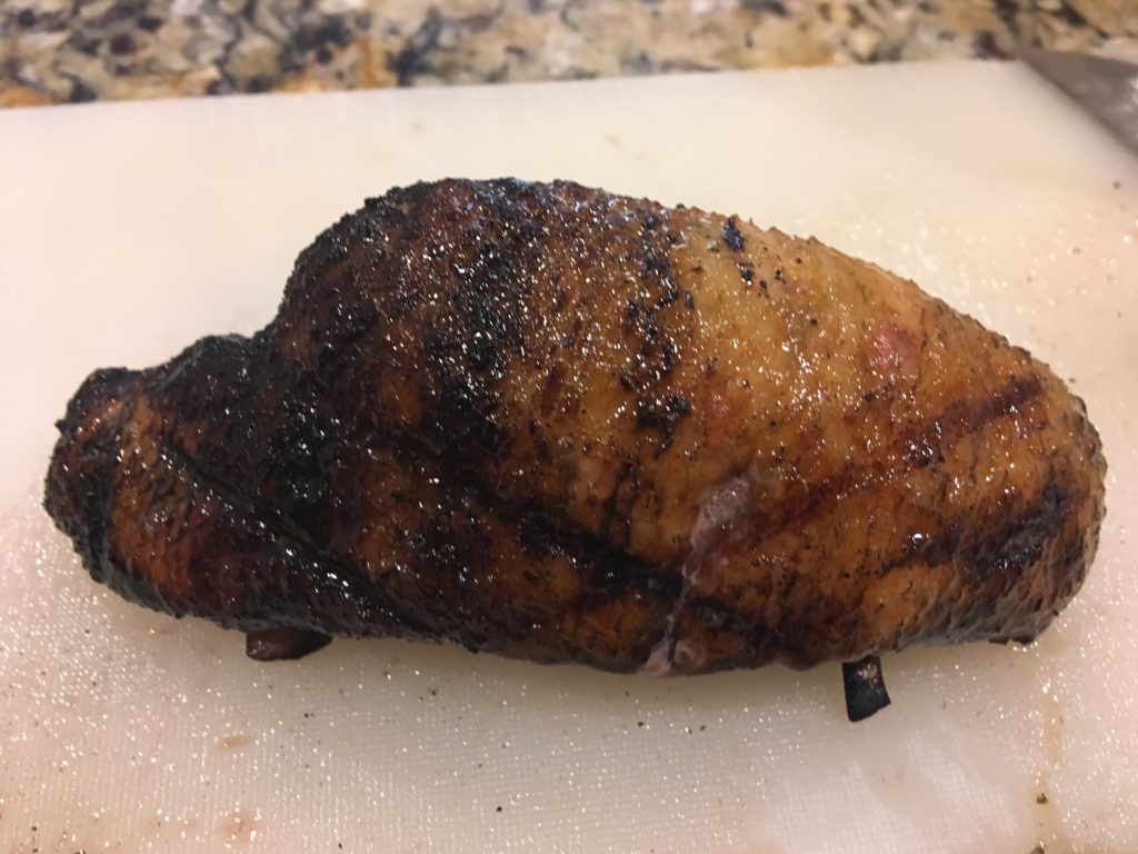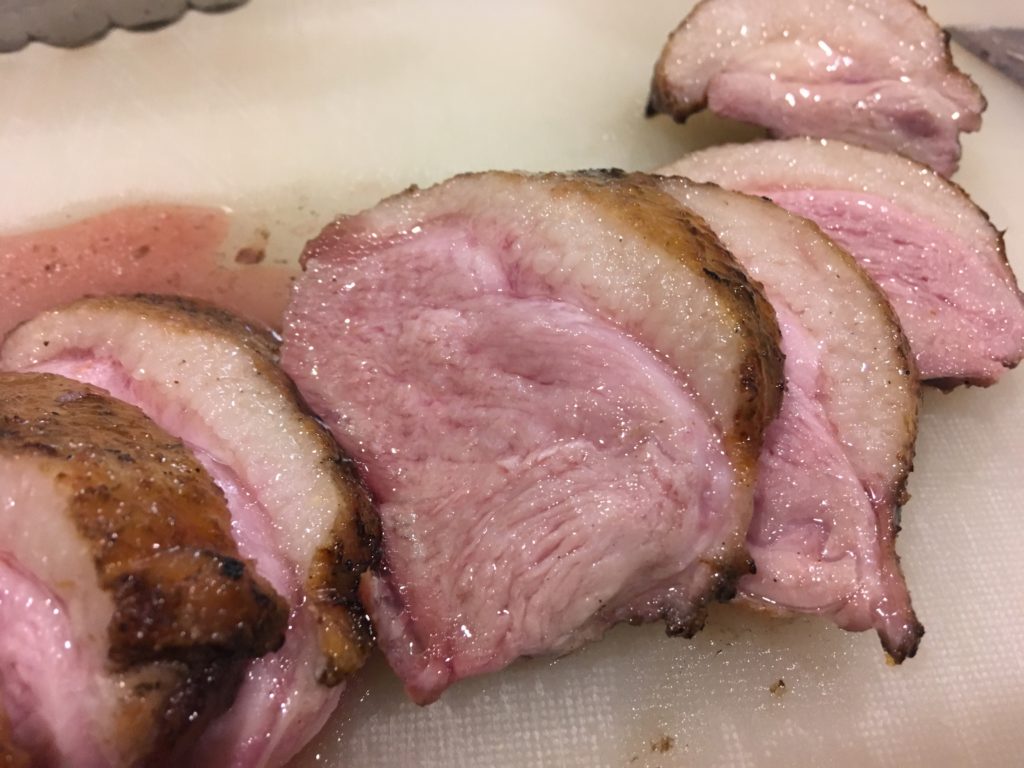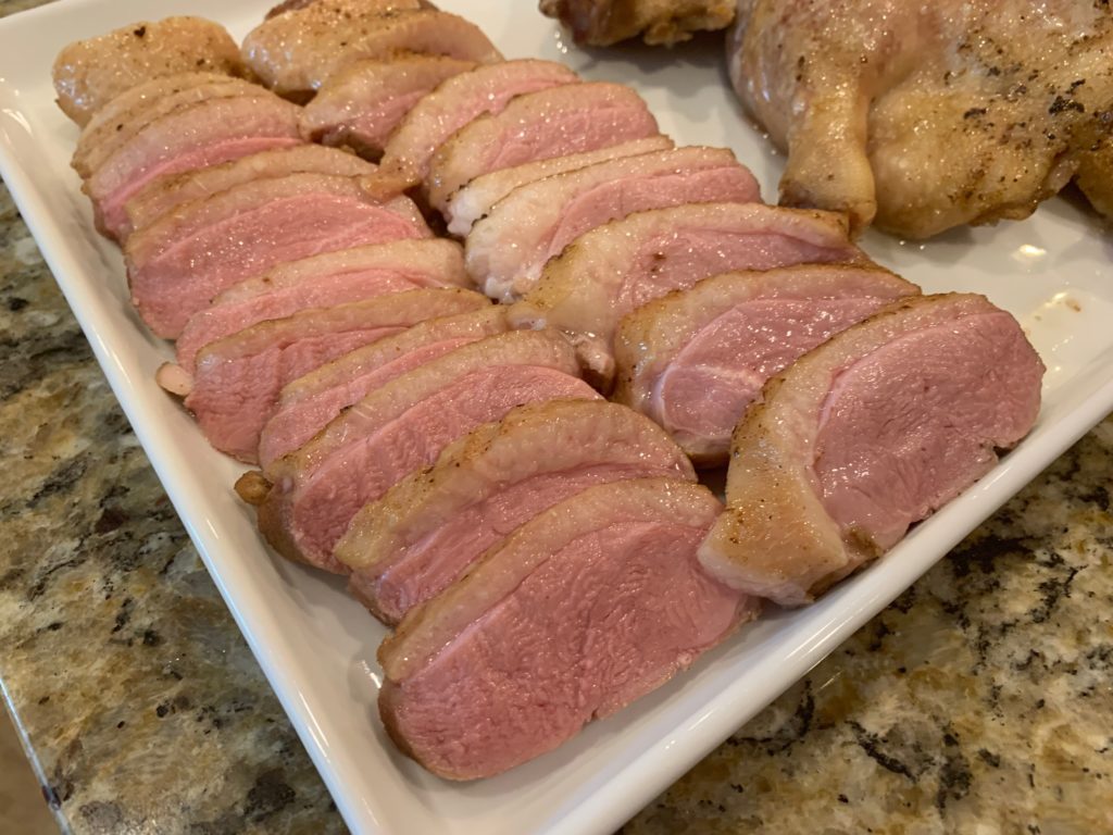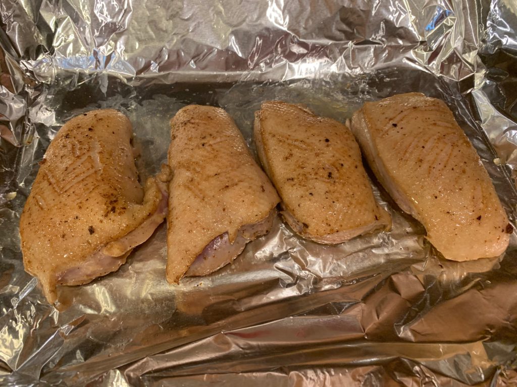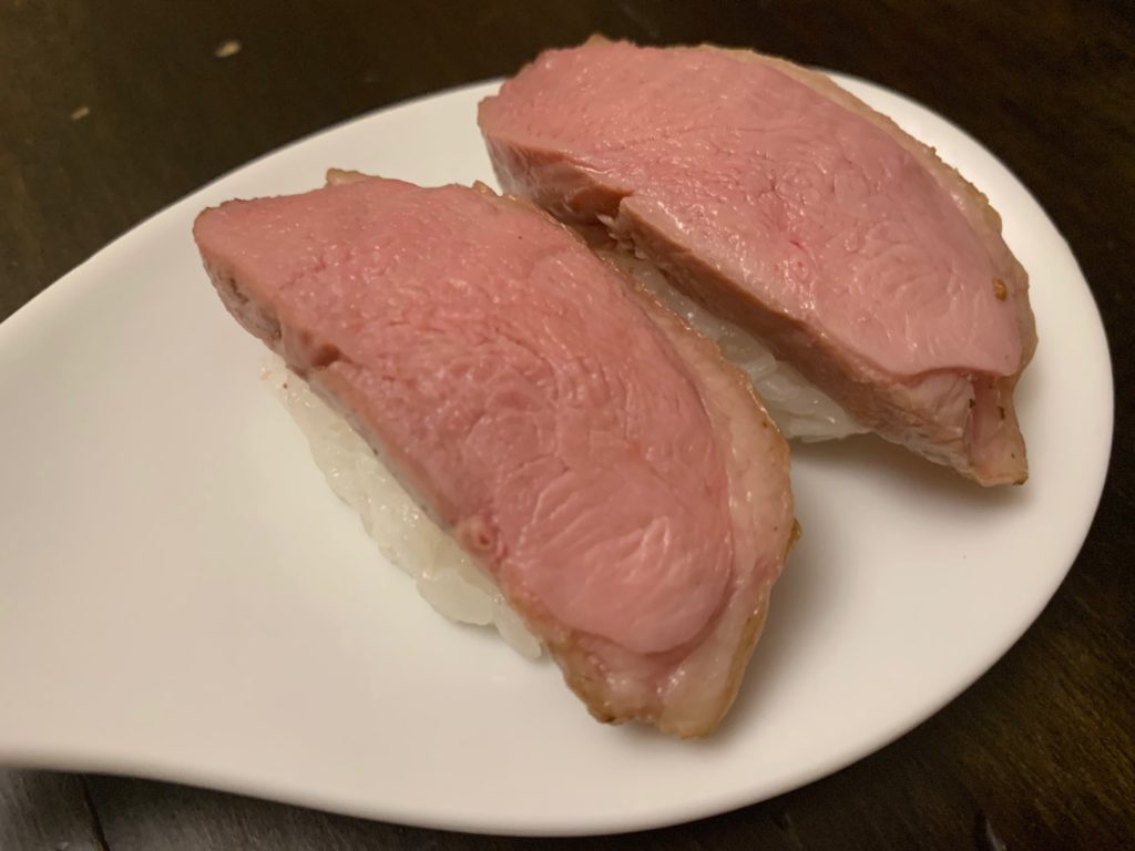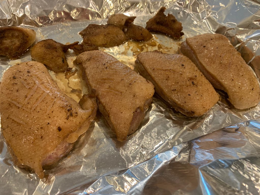 ムネとモモは黙って塩をして高温のフライパンで表面だけ焼いた。殺菌のため。ムネはそのあと、60℃ (140F) のオーブンで2時間。