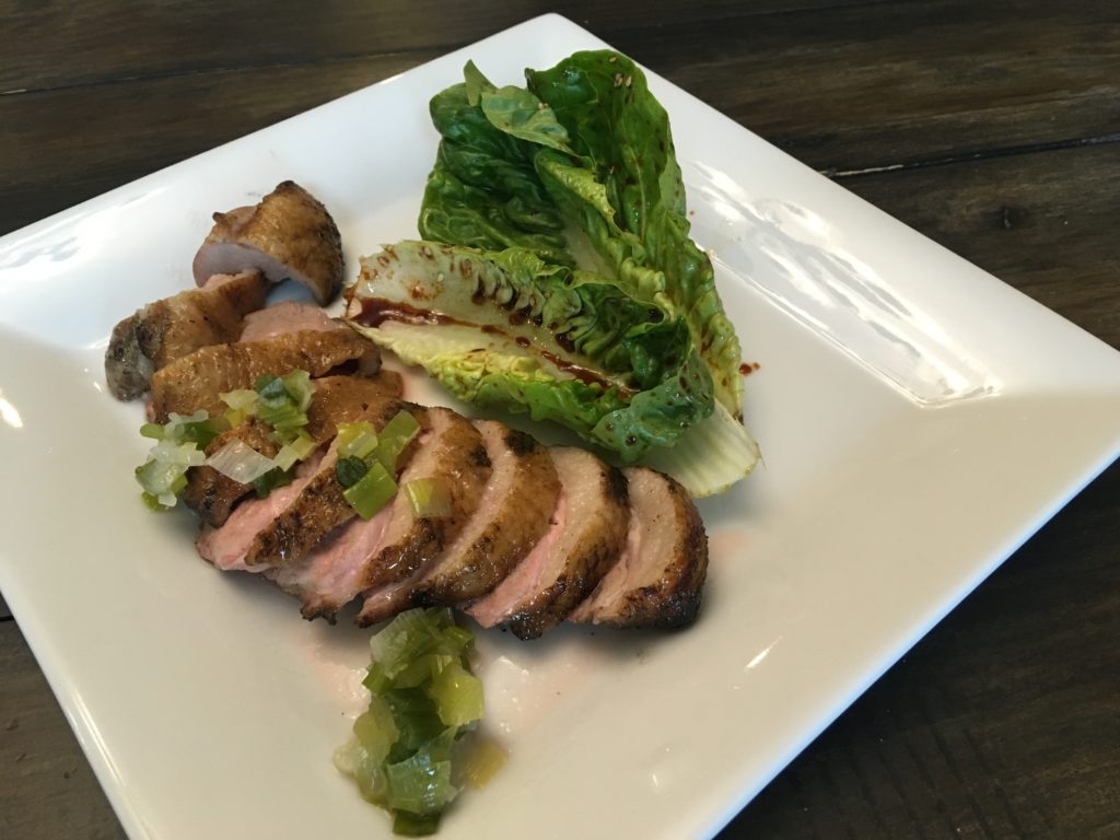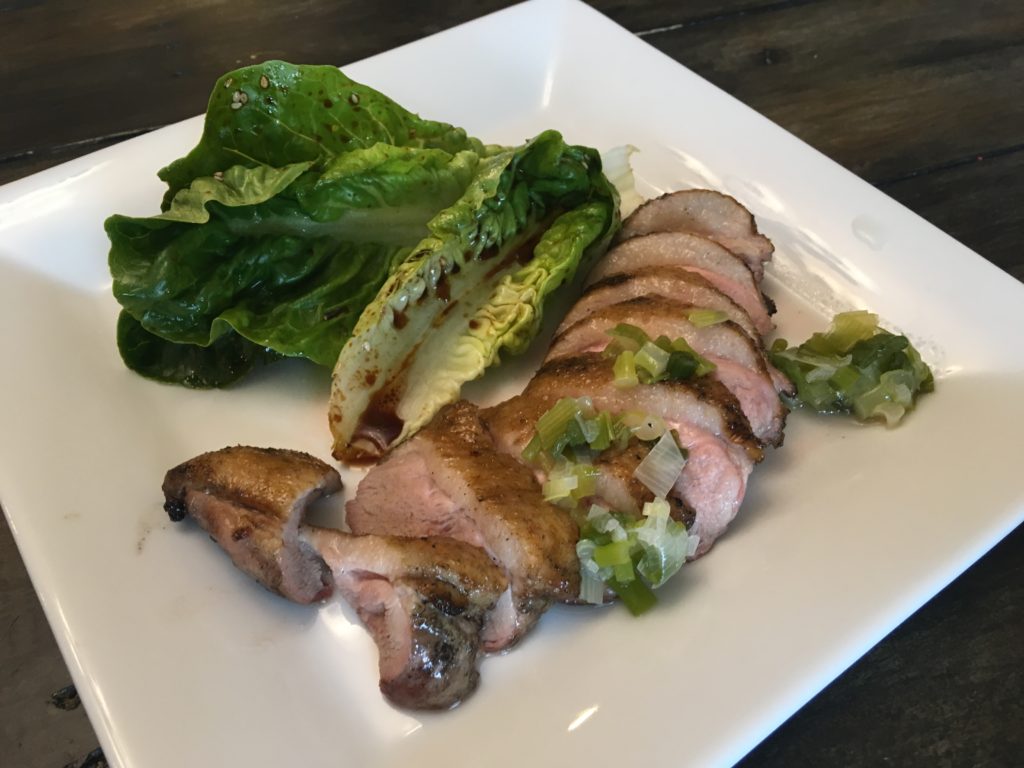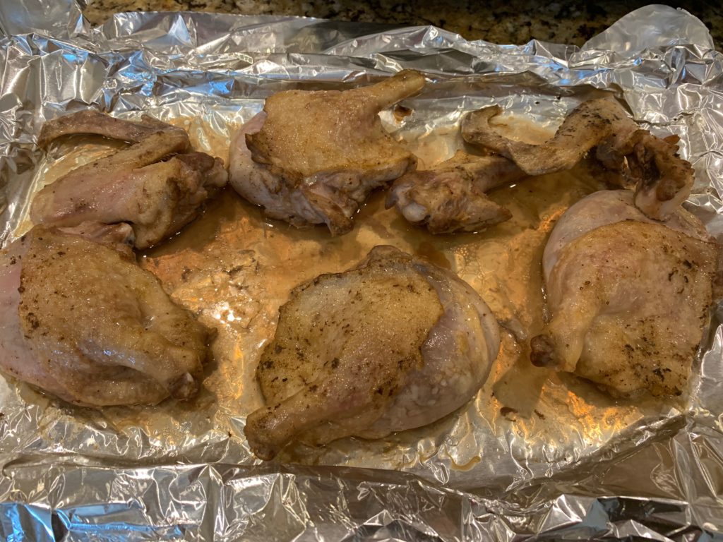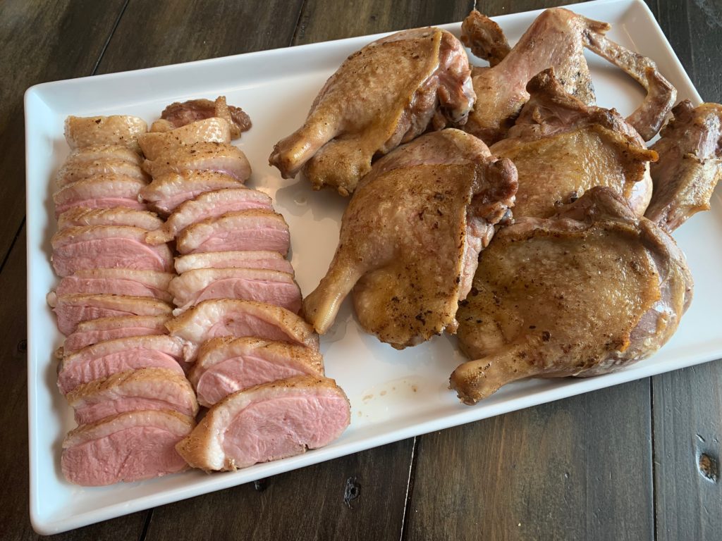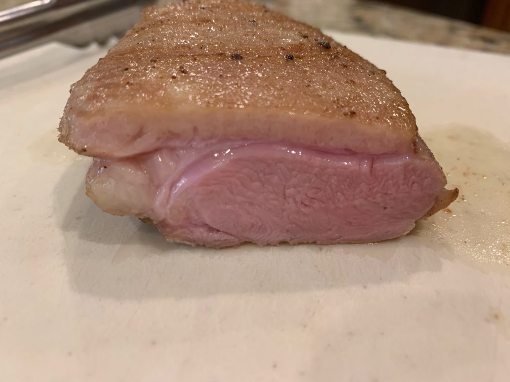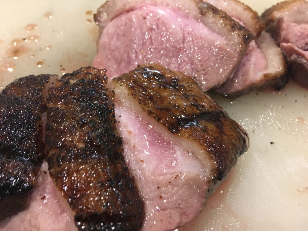 ムネとモモは黙って塩をして高温のフライパンで表面だけ焼いた。殺菌のため。ムネはそのあと、60℃ (140F) のオーブンで2時間。