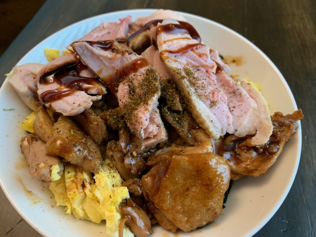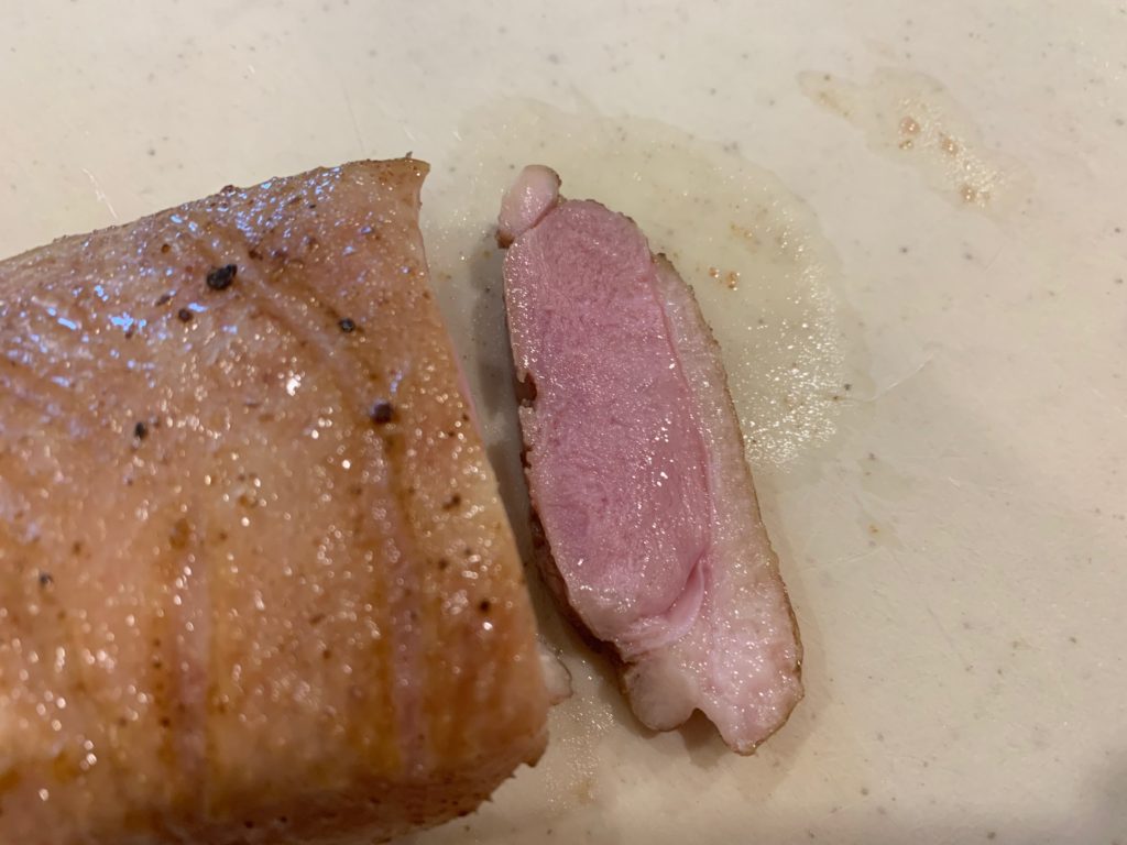 モモ、フライパンで表面焼いたと、Broil Highで3分、その後60℃ (140F) にセット。ムネは60℃までオーブンが下がってから入れる。