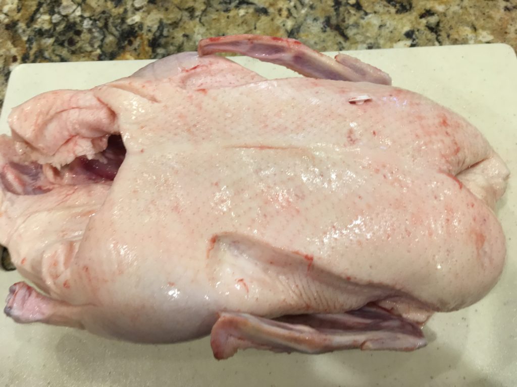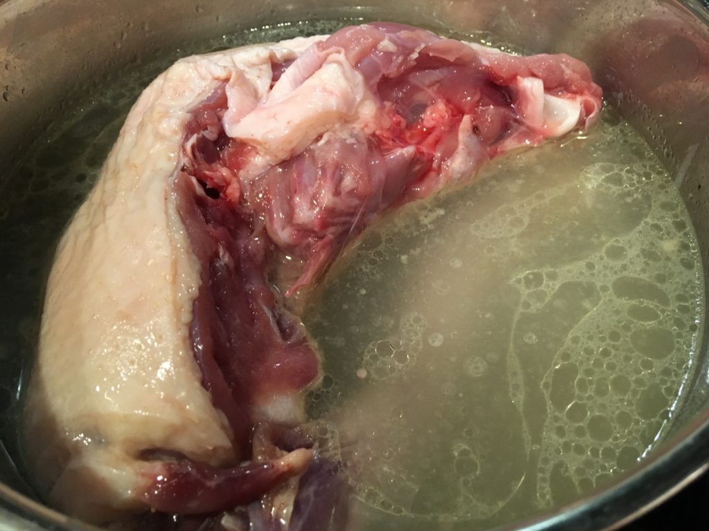 皮を茹でた汁に鴨ガラを。ラーメン等のスープになります。