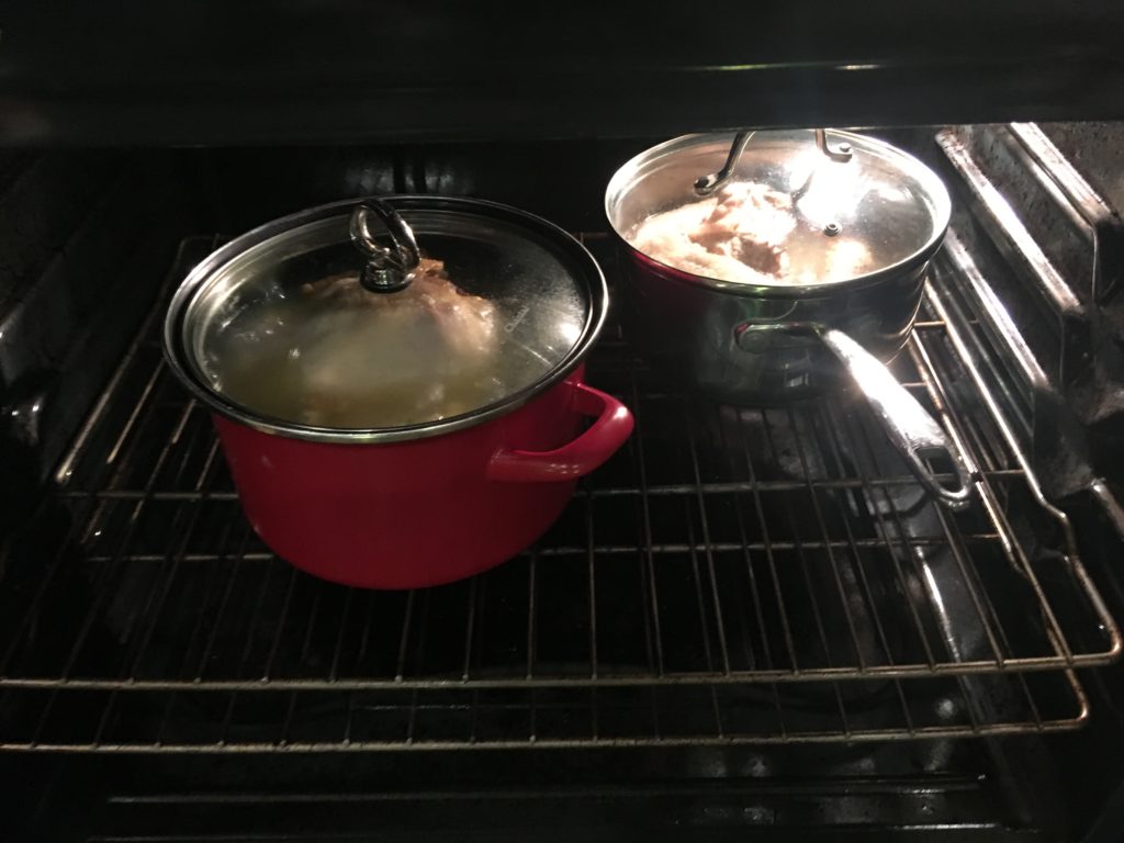 120℃ (250F) のオーブンへ。左の雑ゲタンと仲良く。