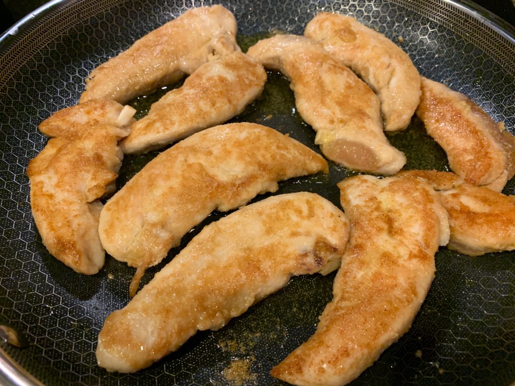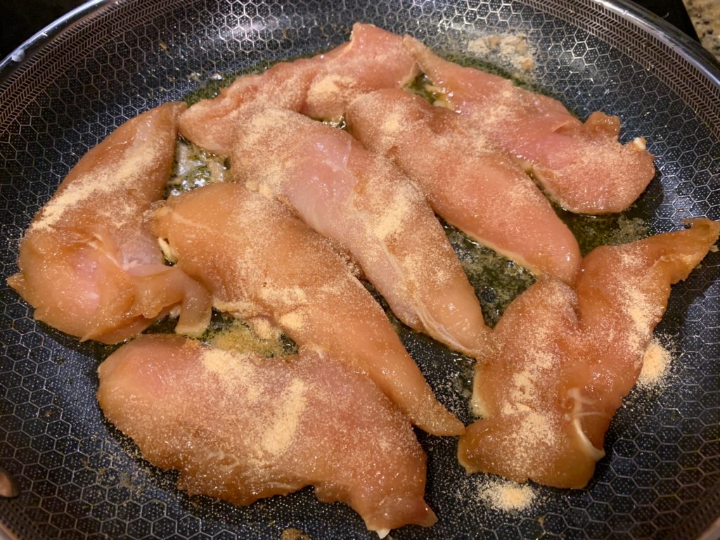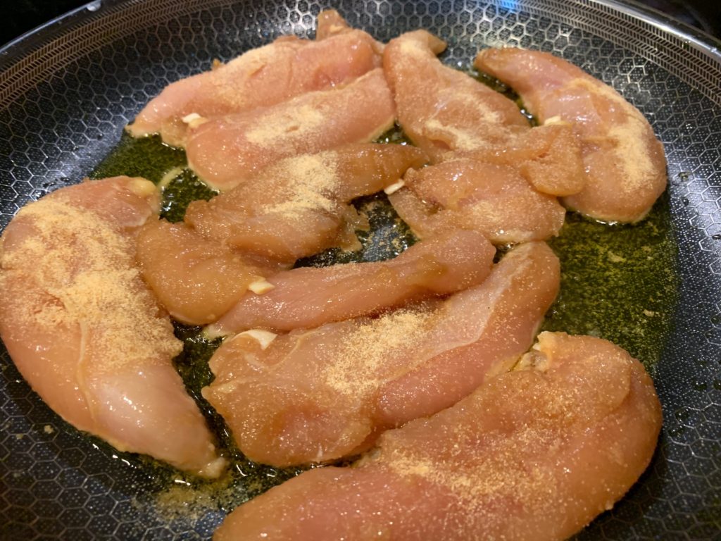 しっかり温まったら、一枚一枚ガーリックパウダーをもう一度。