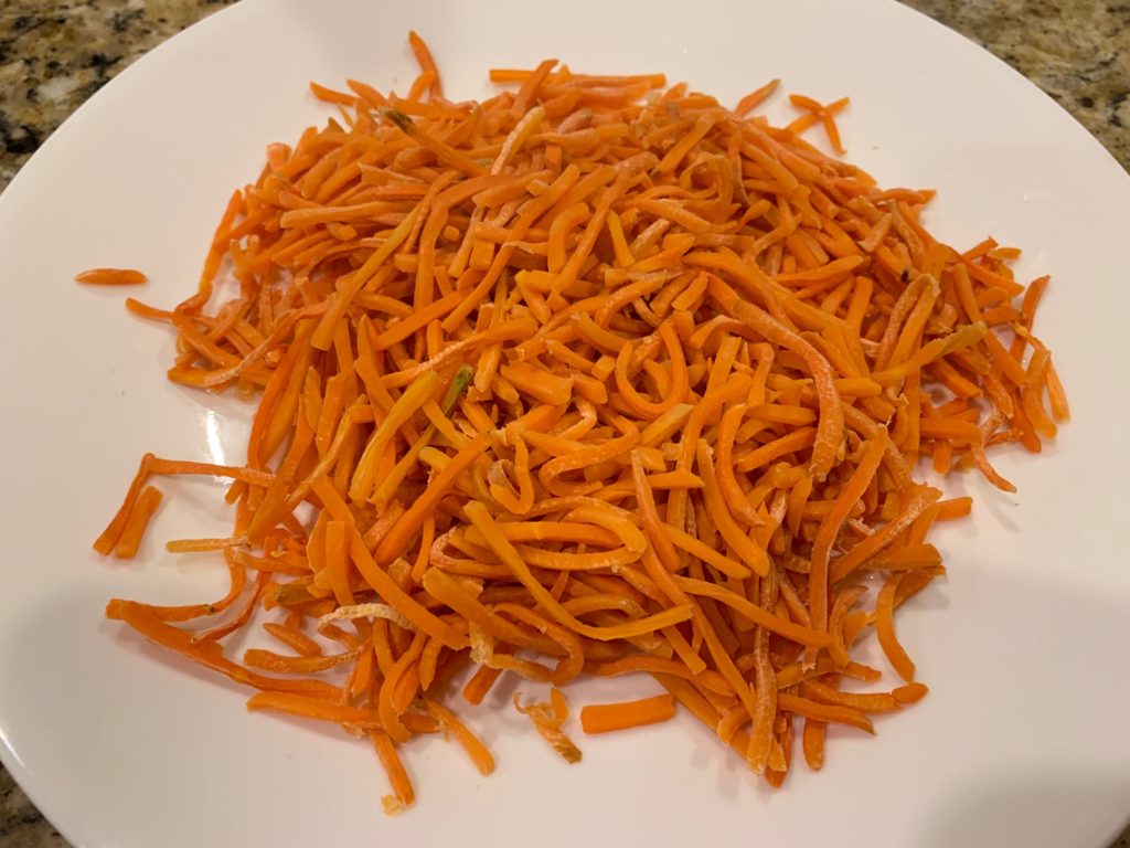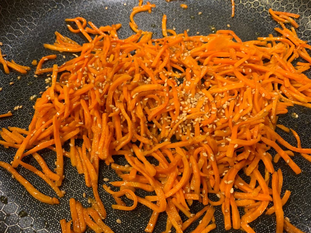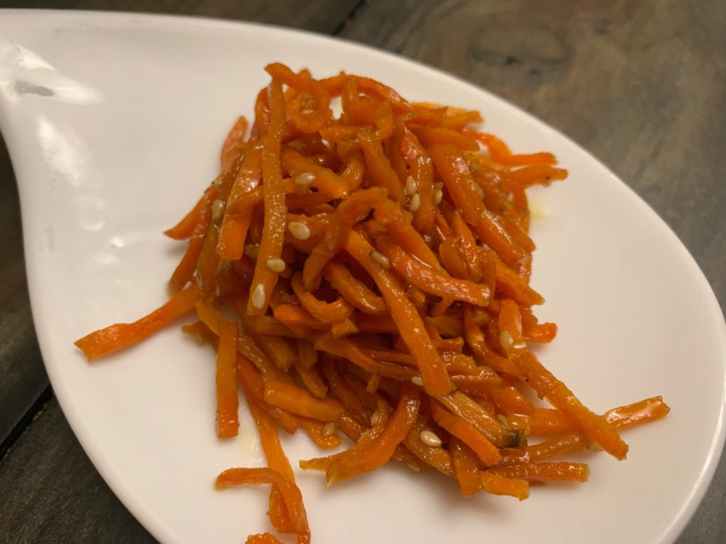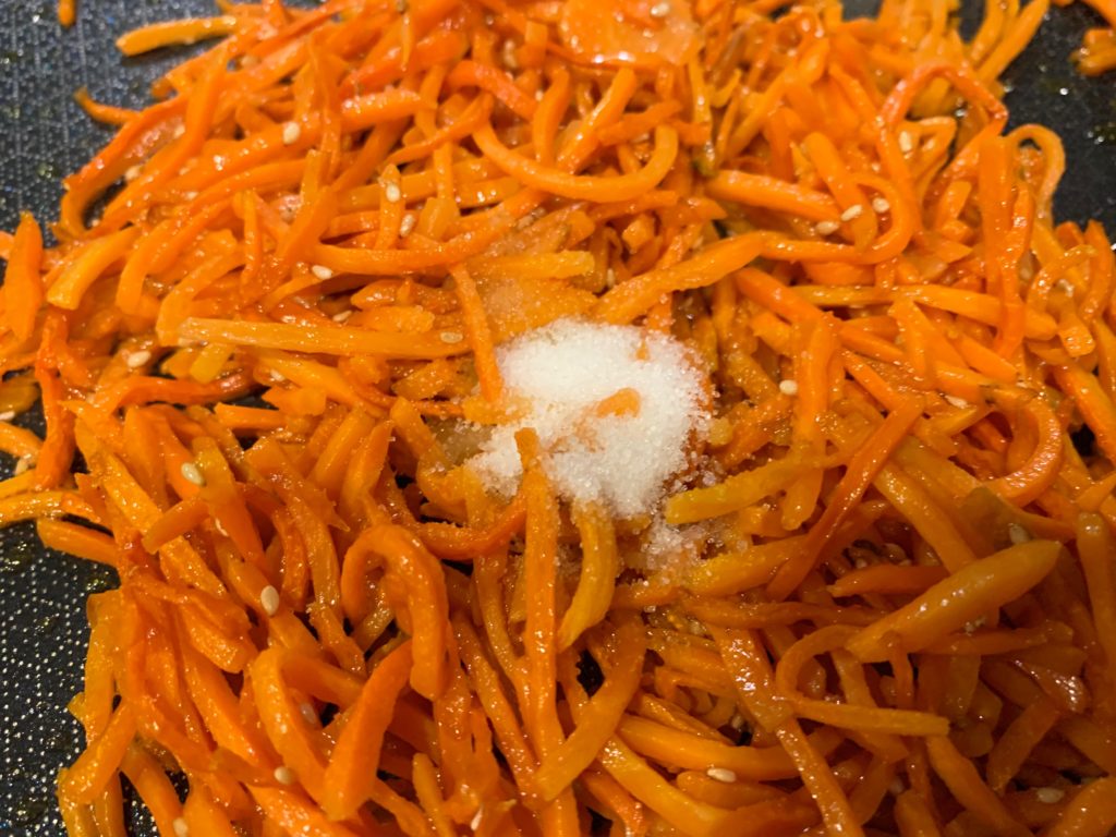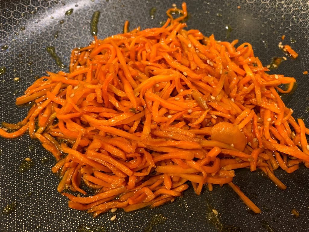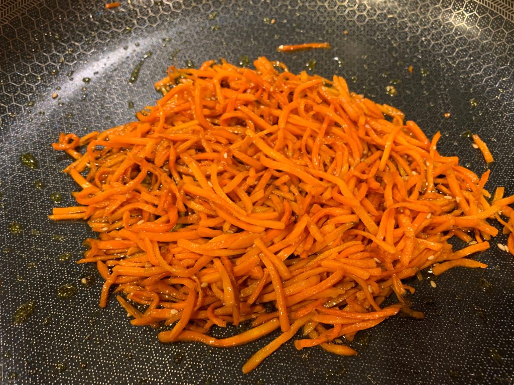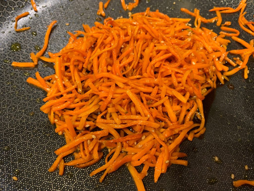 一旦人参から水分を取り去って乾かしたところに砂糖と本つゆを染み込ませる。