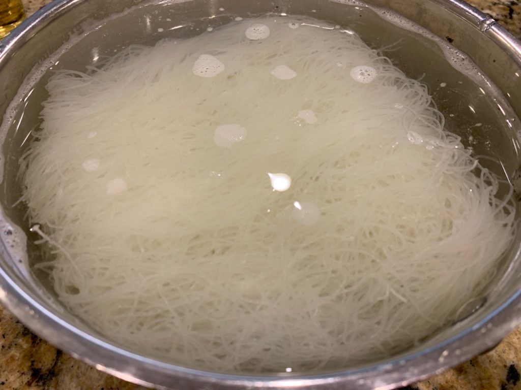 卵焼き作る間に、ビーフンをお風呂くらいの温度のお湯に。