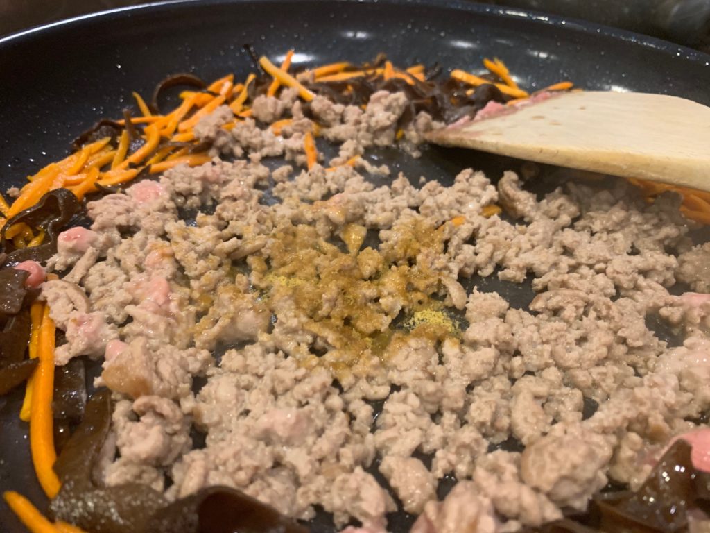 肉が入ってなくてもいいと思うけど、ターキー挽肉。単に安いから(笑)。