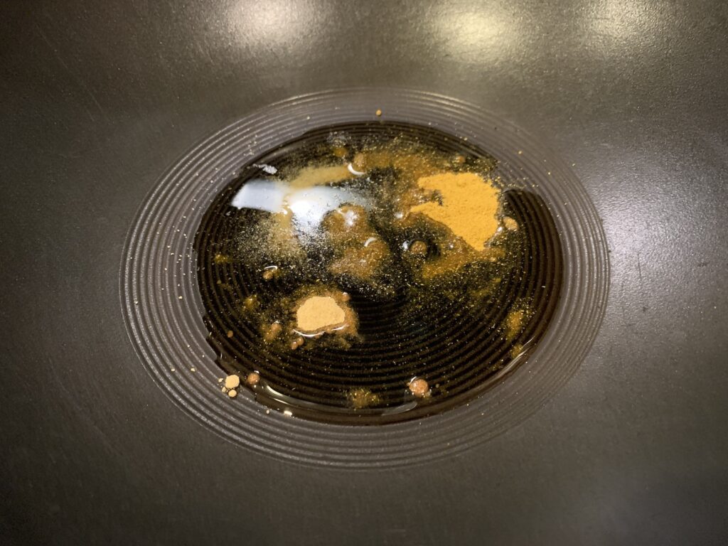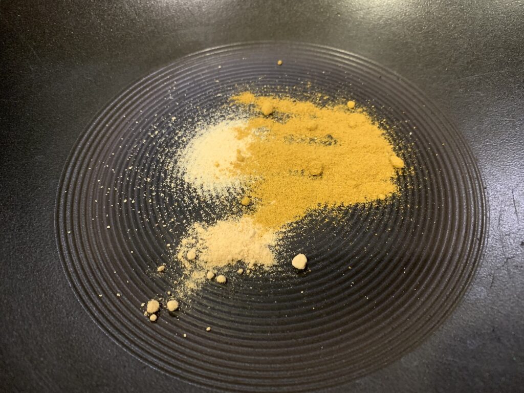 中華鍋(またはフライパン)にカレーパウダー、ガーリックパウダー、生姜パウダー。日本の「カレー粉」ならそれだけで十分。