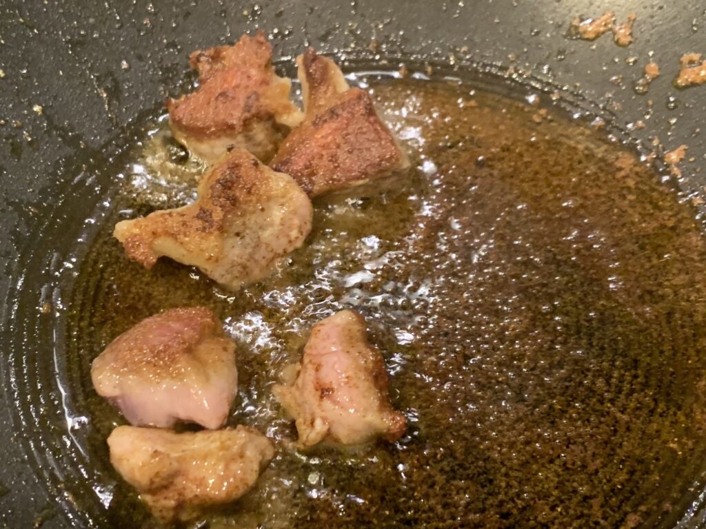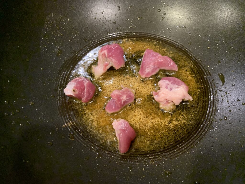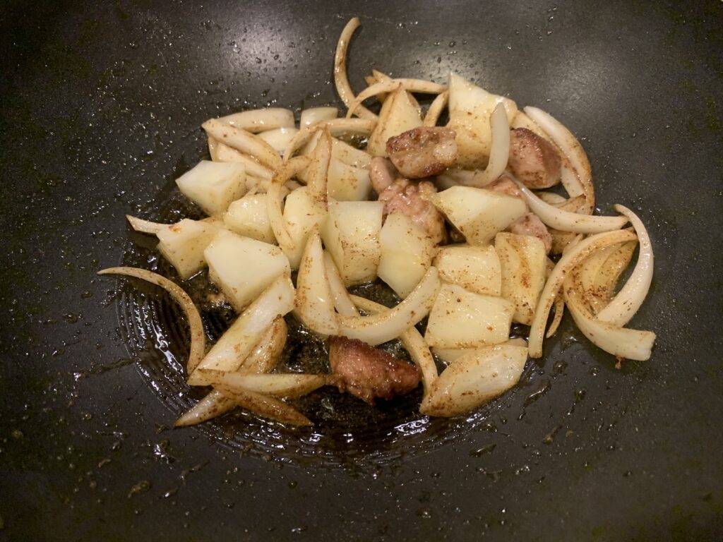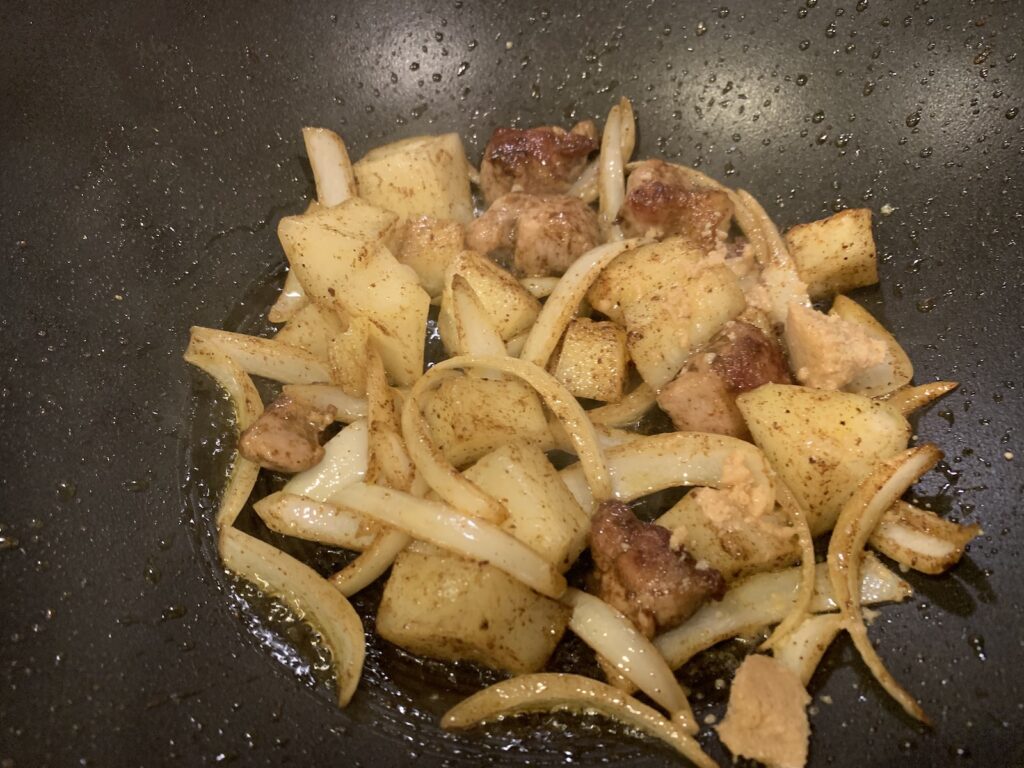 豚肉を強火で炒める。ジャガイモ、この頃に水切って4分レンチン。