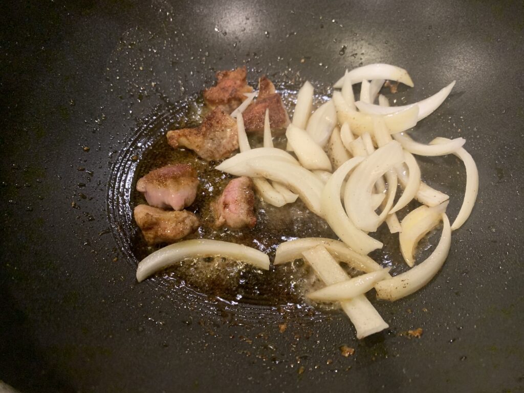 タマネギ投入。逃げずに強火で炒めよう。