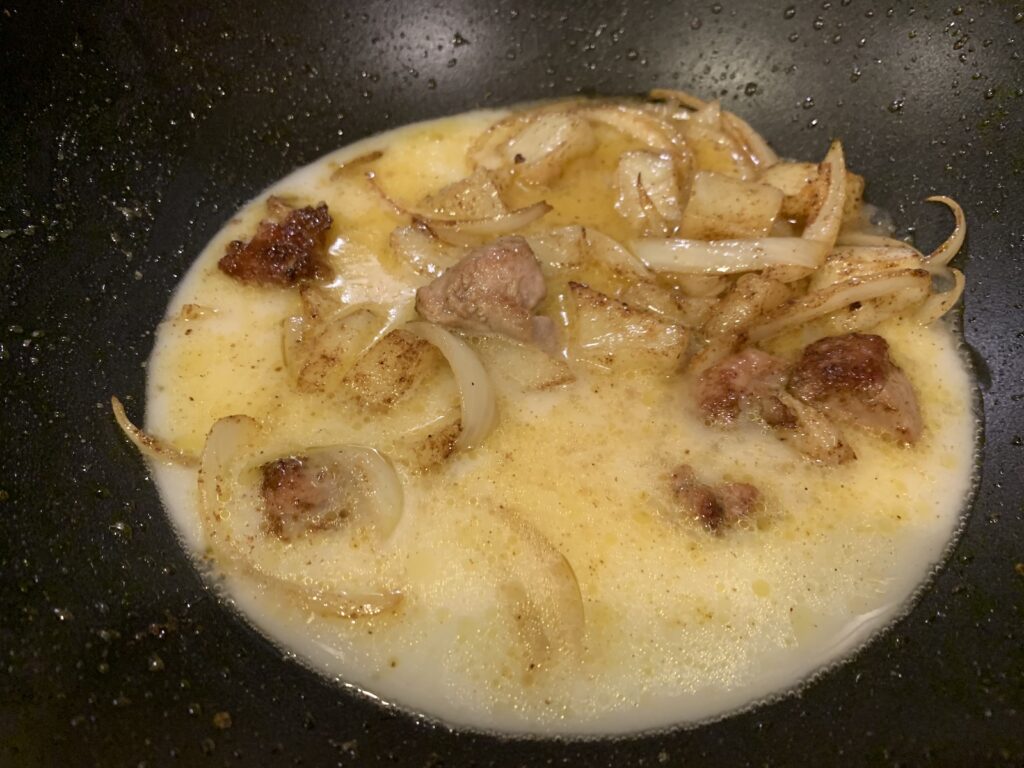 鍋へ。逃げずに強火のままで。白っぽさが消えるまで。とろみが出てくる。