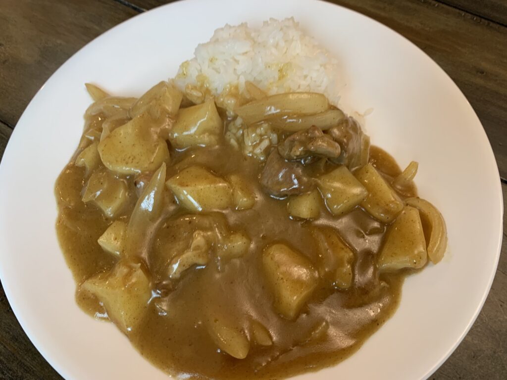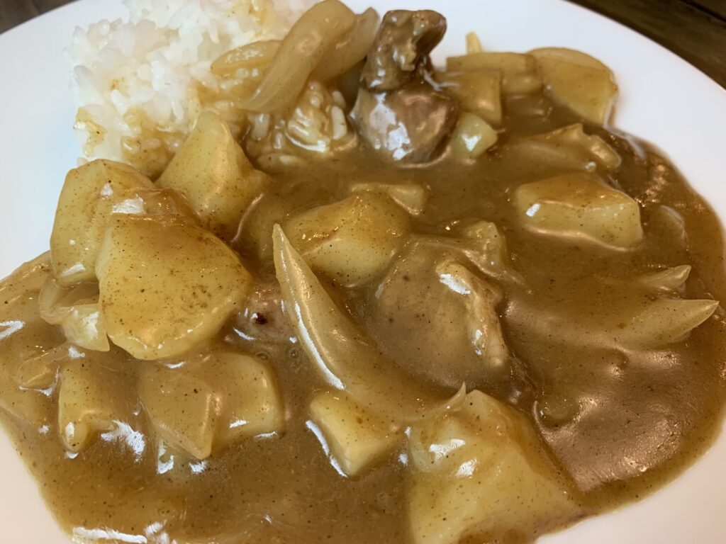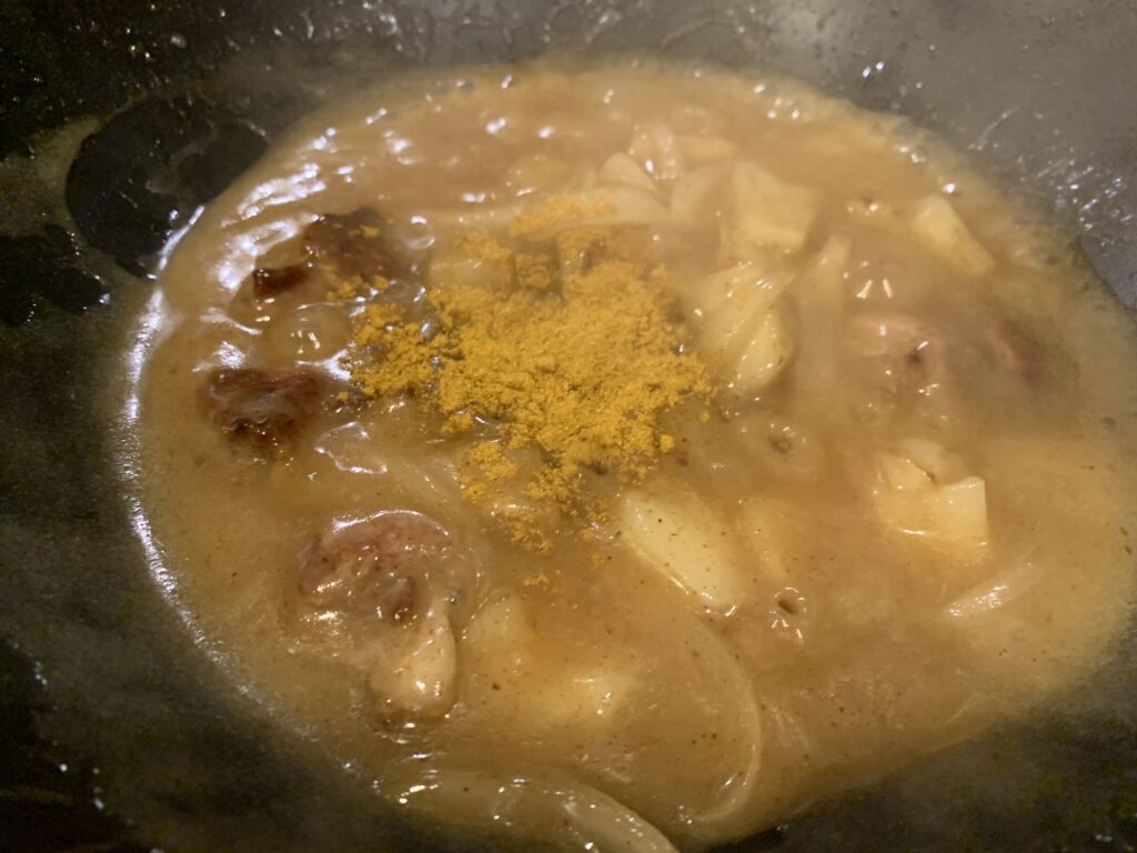 もう一度カレー粉を混ぜたら出来上がり。塩と醤油で調整して火を止める。