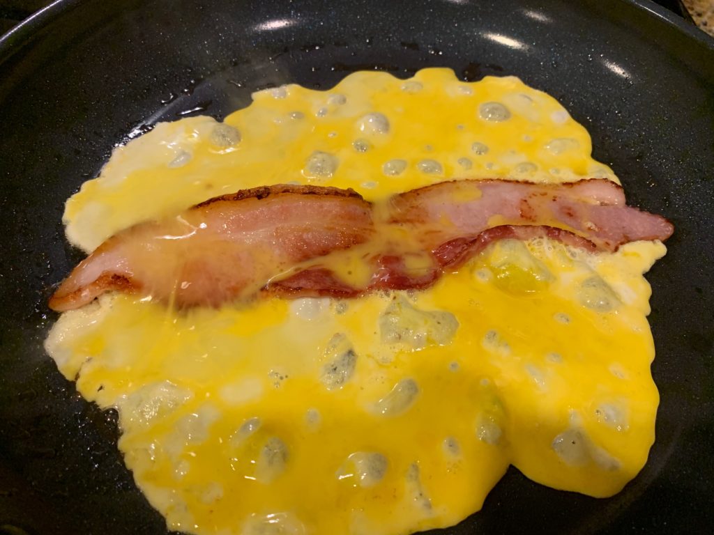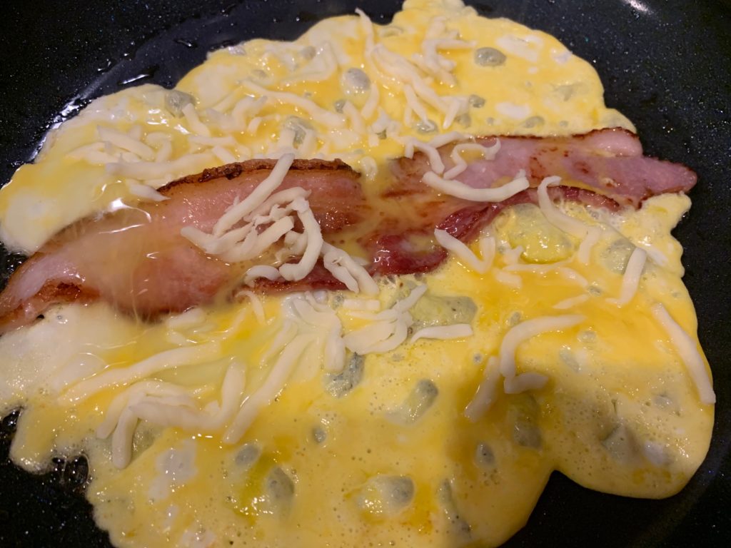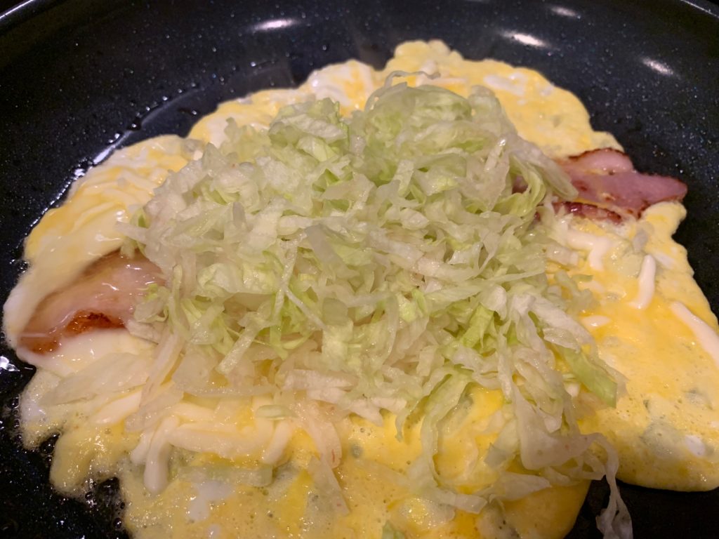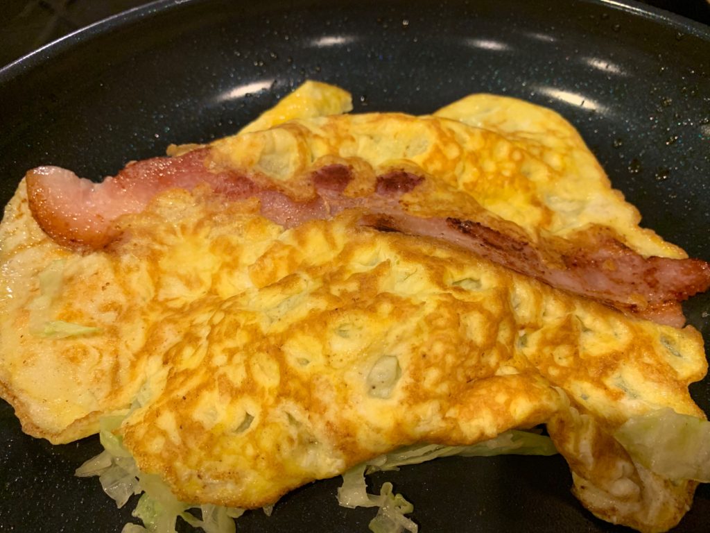 ちょっと残した卵をかけて、そのままお好み焼きのようにひっくり返した。このままベーコンを中心に三つ折りにするのもアリ。