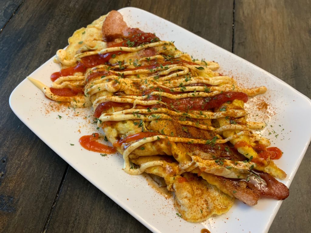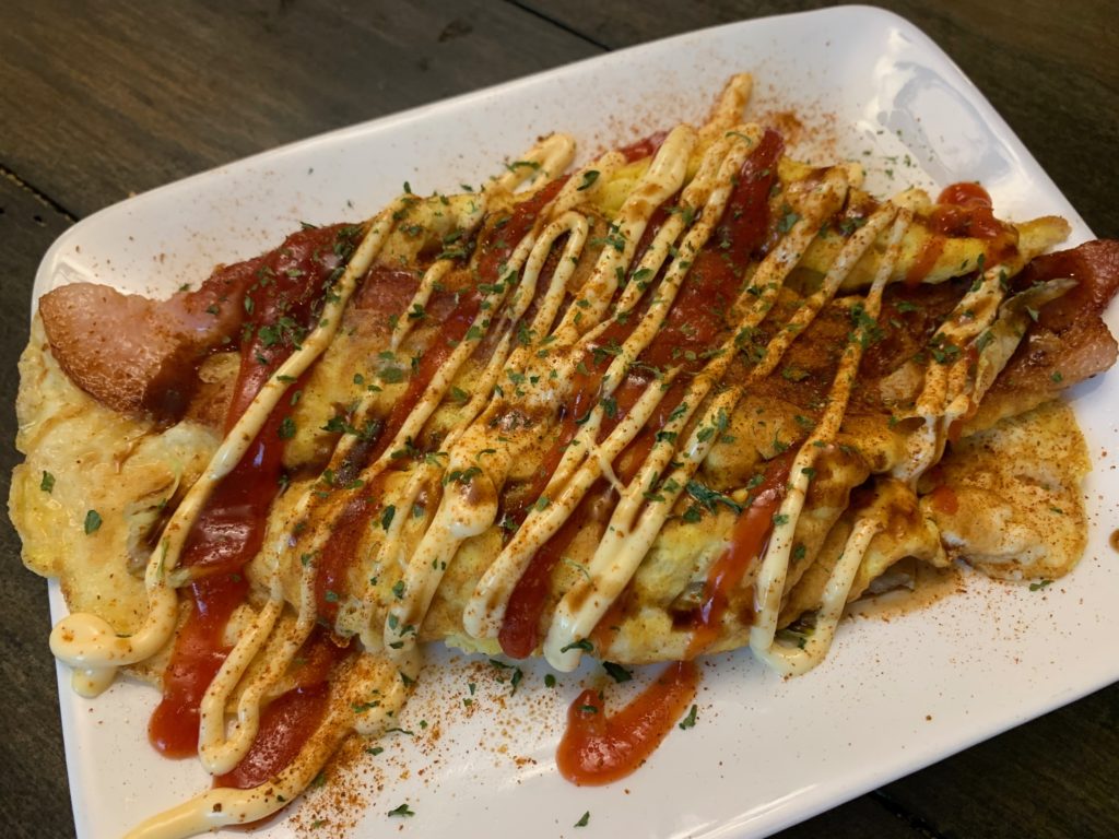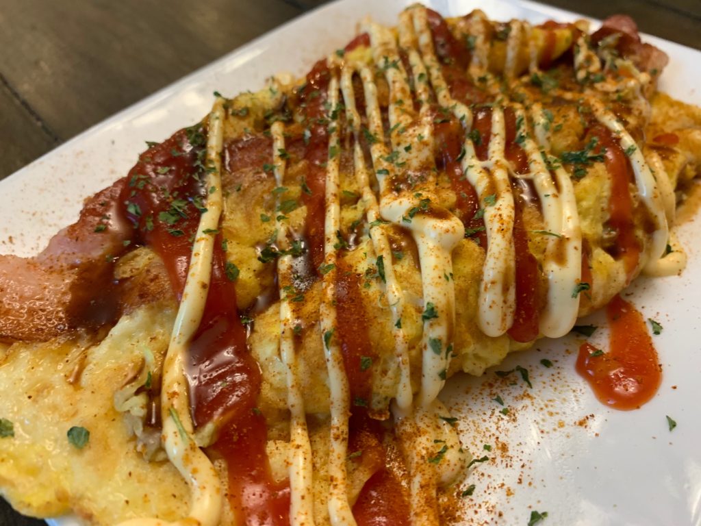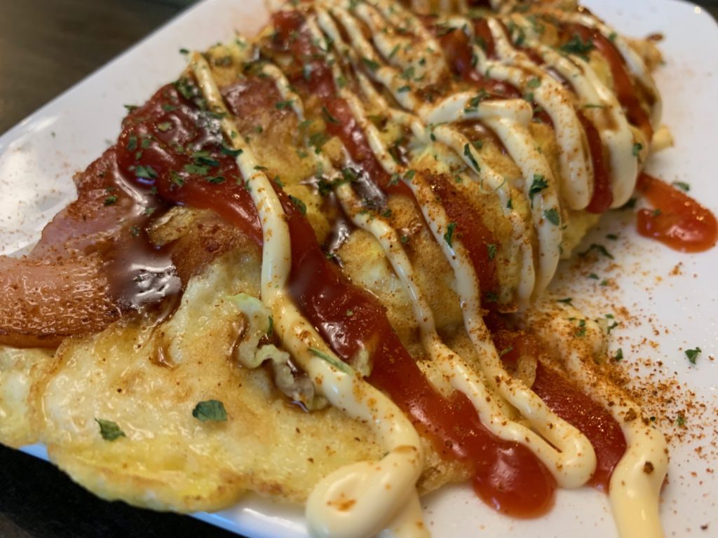 ちょっと残した卵をかけて、そのままお好み焼きのようにひっくり返した。このままベーコンを中心に三つ折りにするのもアリ。