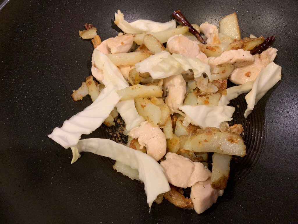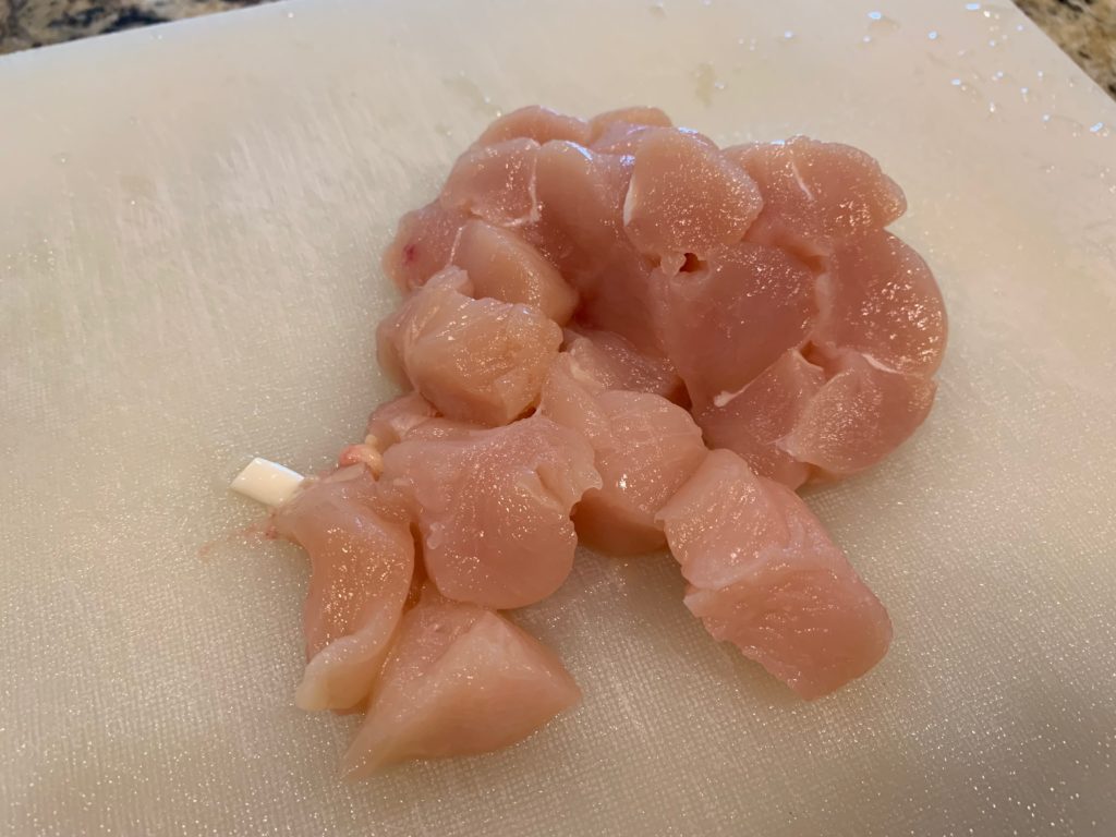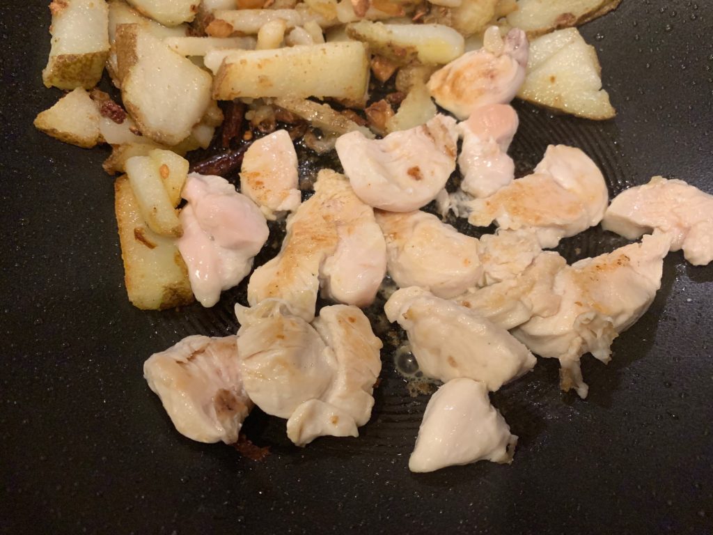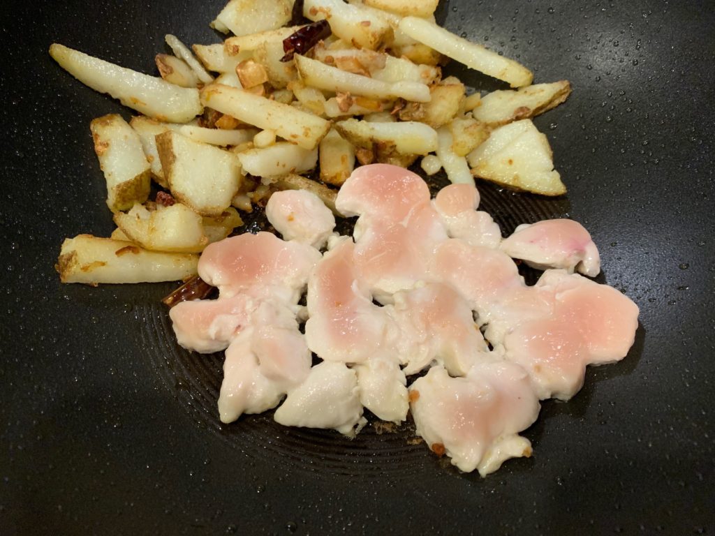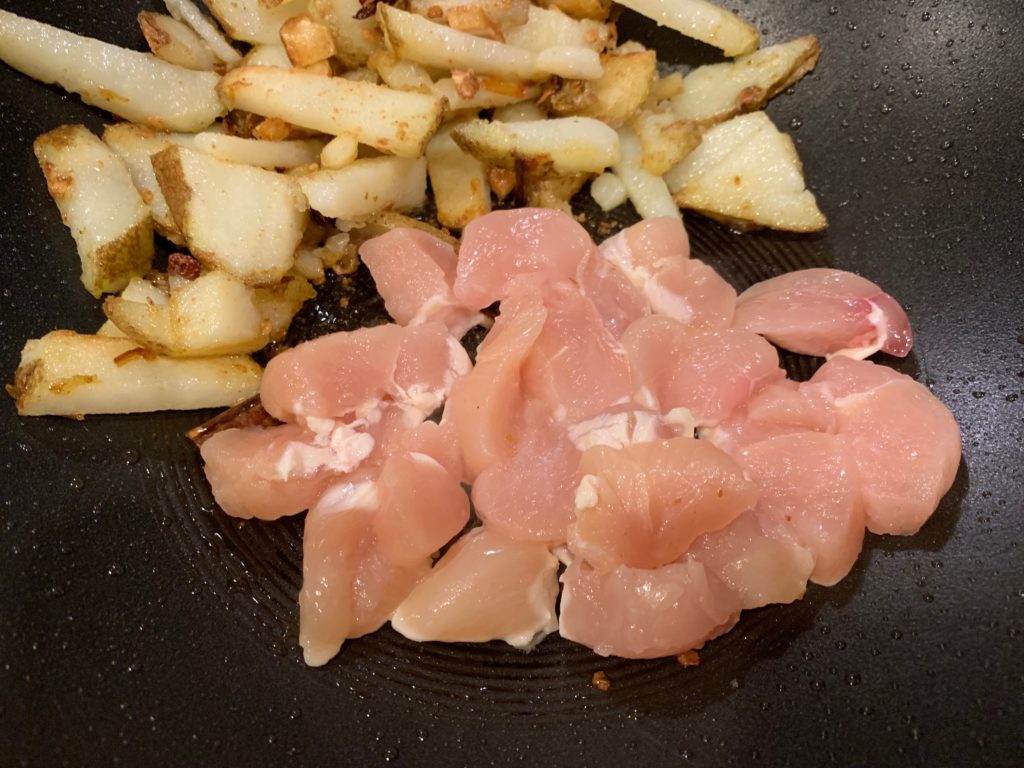 たまたまあった鶏ササミ。肉なら何でも良さげ。どうせ辛いので。野菜、じゃがいもをすでに切ったまな板で。このあとディッシュウォッシャー行きにして、この料理で発生する汚れまな板荒いは1枚。