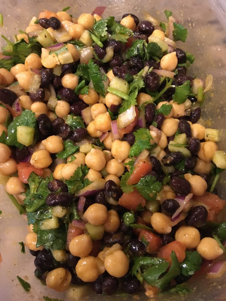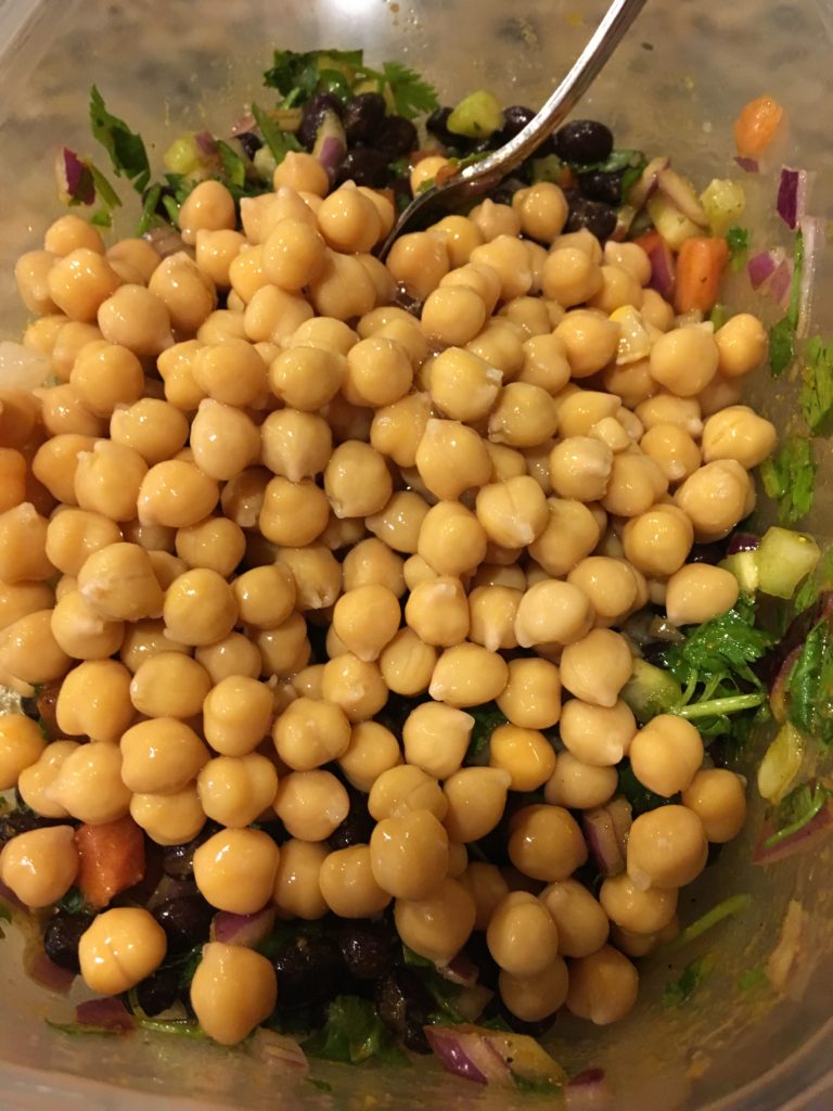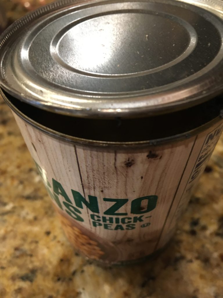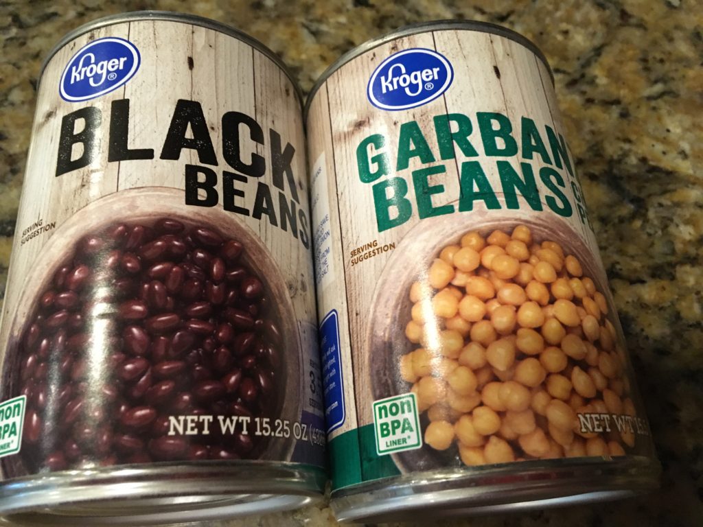 豆缶。セールで両方足しても$1.5行かない。めちゃ安。ブラックビーンズとガバンゾビーンズ(ひよこ豆)。