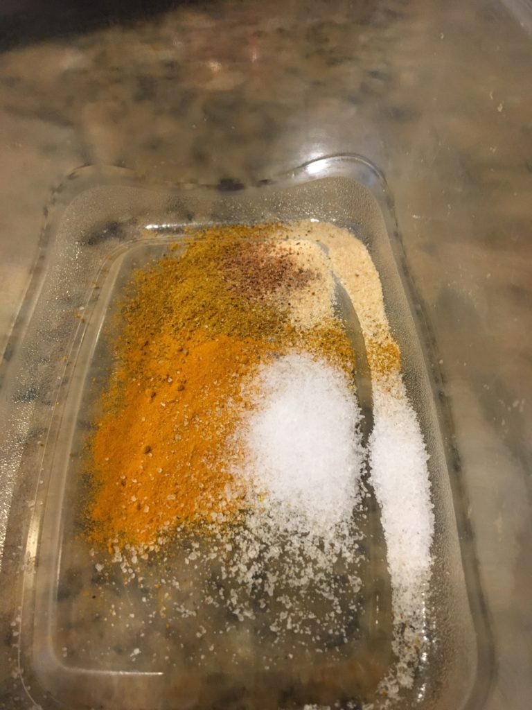 カレー粉とその仲間、塩、ガーリックパウダー。